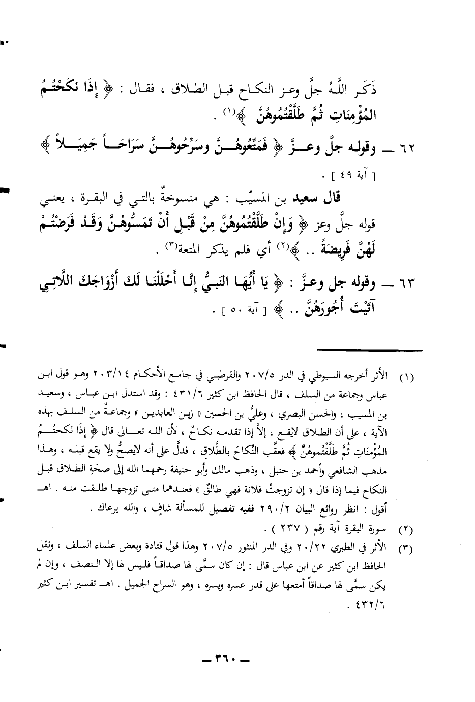المؤمنات ثم طلقتموهن 62 - وقوله جل وعز فمتعوهن وسرحوهن سراحا جميلا قال سعيد بن المسيب هي منسوخة بالتي في البقرة يعني قوله جل وعز وإن طلقتموهن من قبل أن تمسوهن وقد فرضتم لهن فريضة أي فلم يذكر المتعة 63 - وقوله جل وعز يا أيها النبي إنا حللنا لك أزواجك اللاتي آتيت أجورهن آية 50