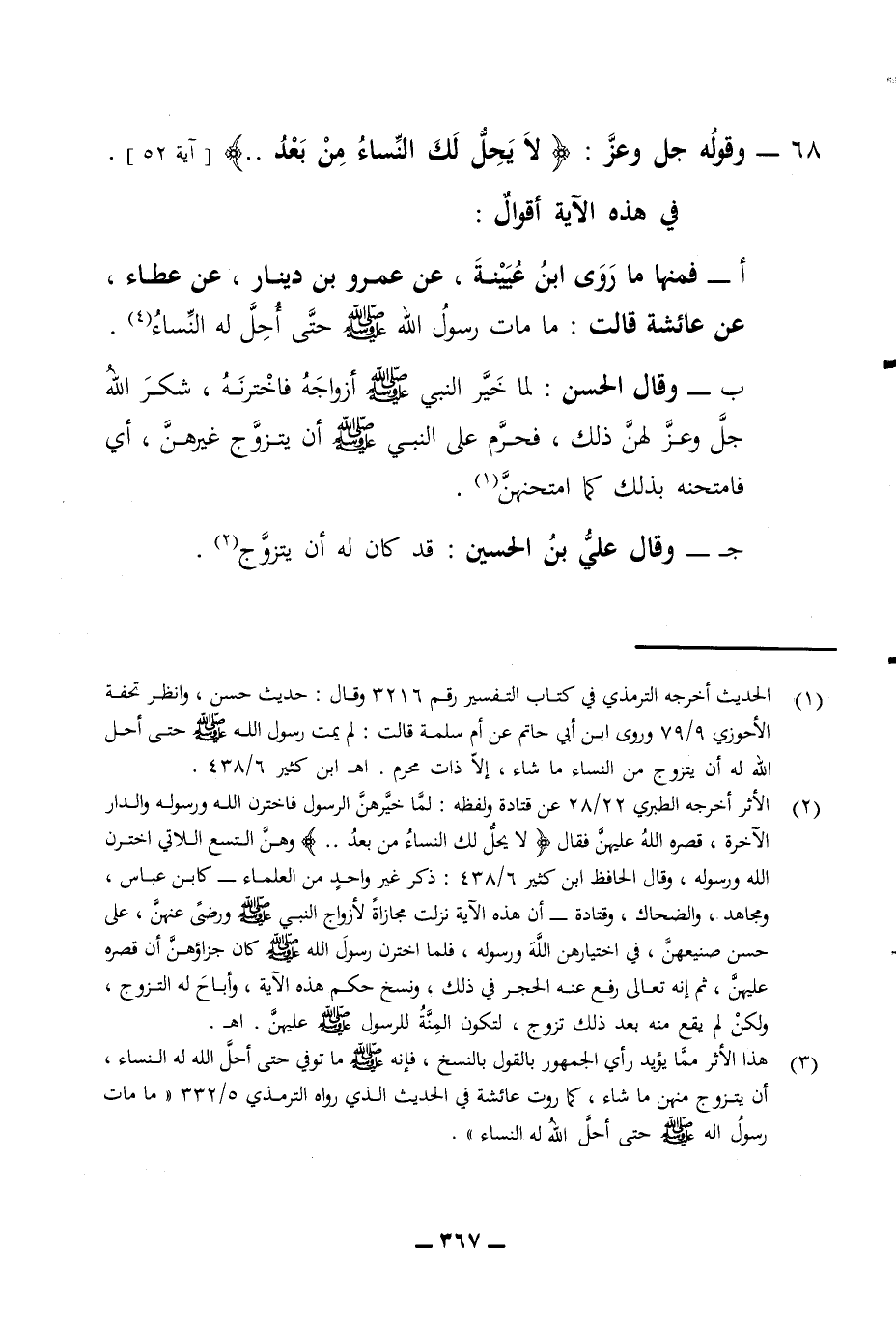 68 - وقوله جل وعز لا يحل لك النساء من بعد آية 52 في هذه الآية أقوال فمنها ما روى ابن عيينة عن عمرو بن دينار عن عطاء عن عائشة قالت ما مات رسول الله صلى الله عليه وسلم حتى أحل له النساء وقال الحسن لما خير النبي صلى الله عليه وسلم أزواجه فاخترنه شكر الله جل وعز لهن ذلك فحرم على النبي صلى الله عليه وسلم أن يتزوج غيرهن أي فامتحنه بذلك كما امتحنهن وقال علي بن الحسين قد كان له أن يتزوج