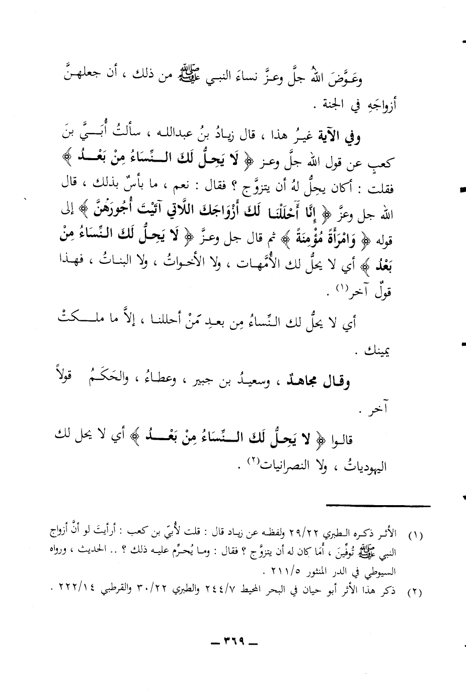 وعوض الله جل وعز نساء النبي صلى الله عليه وسلم من ذلك أن جعلهن أزواجه في الجنة وفي الآية غير هذا قال زياد بن عبد الله سألت أبي بن كعب عن قول الله جل وعز لا يحل لك النساء من بعد فقلت أكان يحل له أن يتزوج فقال نعم ما بأس بذلك قال الله جل وعز إنا أحللنا لك أزواجك اللاتي آتيت أجورهن إلى قوله وامرأة مؤمنة ثم قال جل وعز لا يحل لك النساء من بعد أي لا يحل لك الأمهات ولا الأخوات ولا البنات فهذا قول آخر أي لا يحل لك النساء من بعد من أحللنا إلا ما ملكت يمينك وقال مجاهد وسعيد بن جبير وعطاء والحكم قولا آخر