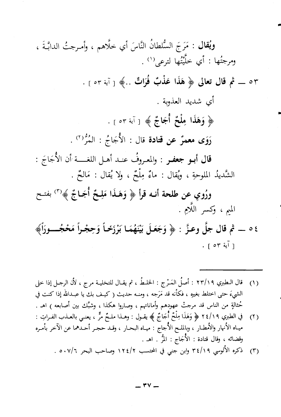 ومرجتها إلى أي خليتها لترعى 53 - ثم قال تعالى هذا عذب فرات آية 53 أي شديد العذوبة وهذا ملح أجاج آية 53 روى معمر عن قتادة قال الأجاج المر قال أبو جعفر والمعروف عند أهل اللغة أن الأجاج الشديد الملوحة ويقال ماء ملح ولا يقال مالح وروي عن طلحة أنه قرأ وهذا ملح أجاج بفتح الميم وكسر اللام 54 - ثم قال جل وعز وجعل بينهما برزخا وحجرا محجورا آية 53