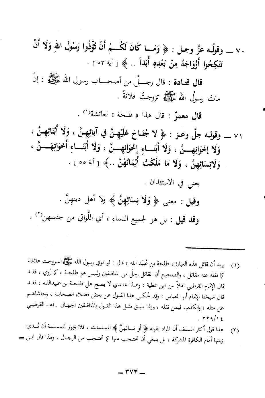 70 - وقوله عزو جل وما كان لكم أن تؤذوا رسول الله ولا أن تنكحوا أزواجه من بعده أبدا آية 53 قال قتادة قال رجل من أصحاب رسول الله صلى الله عليه وسلم إن مات رسول الله صلى الله عليه وسلم تزوجت فلانة قال معمر قال هذا طلحة لعائشة 71 - وقوله جل وعز لا جناح عليهن في آبائهن ولا أبنائهن ولا إخوانهن ولا أبناء إخوانهن ولا أبناء أخواتهن ولا نسائهن ولا ما ملكت أيمانهن يعني في الاستئذان وقيل معنى ولا نسائهن ولا أهل دينهن وقد قيل بل هو لجميع النساء أي اللواتي من جنسهن
