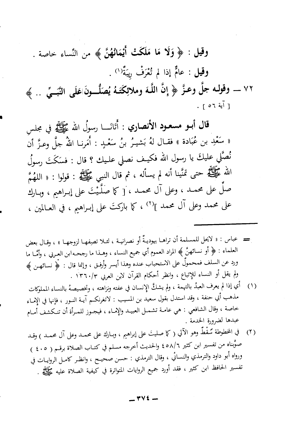 وقيل عام إذا لم تعرف ريبة 72 - وقوله جل وعز إن الله وملائكته يصلون على النبي آية 56 قال أبو مسعود الأنصاري أتانا رسول الله صلى الله عليه وسلم في مجلس سعد بن عبادة فقال له بشير بن سعد أمرنا الله جل وعز أن نصلي عليك يارسول الله فكيف نصلي عليك قال فسكت رسول الله صلى الله عليه وسلم حتى تمنينا أنه لم يسأله ثم قال النبي صلى الله عليه وسلم قولوا اللهم صل على محمد وعلى آل محمد كما صليت على إبراهيم وبارك على محمد وعلى آل محمد كما باركت على إبراهيم في العالمين