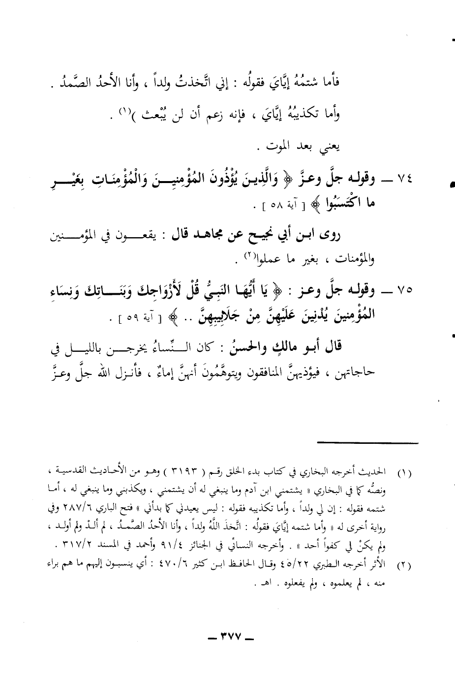 فأما شتمه إياي فقوله إني اتخذت ولدا وأنا الأحد الصمد وأما تكذيبه إياي فإنه زعم أن لن يبعث يعني بعد الموت 74 - وقوله جل وعز والذين يؤذون المؤمنين والمؤمنات بغير ما اكتسبوا لأية 58 روى ابن أبي نجيح عن مجاهد قال يقعون في المؤمنين والمؤمنات بغير ما عملوا 75 - وقوله جل وعز يا أيها النبي قل لأزواجك وبناتك ونساء المؤمنين يدنين عليهن من جلابيبهن آية 59 قال أبو مالك والحسن كان النساء يخرجن بالليل في حاجاتهن فيؤذيهن وإن المنافقون ويتوهمون إنهن إماء فأنزل الله جل وعز
