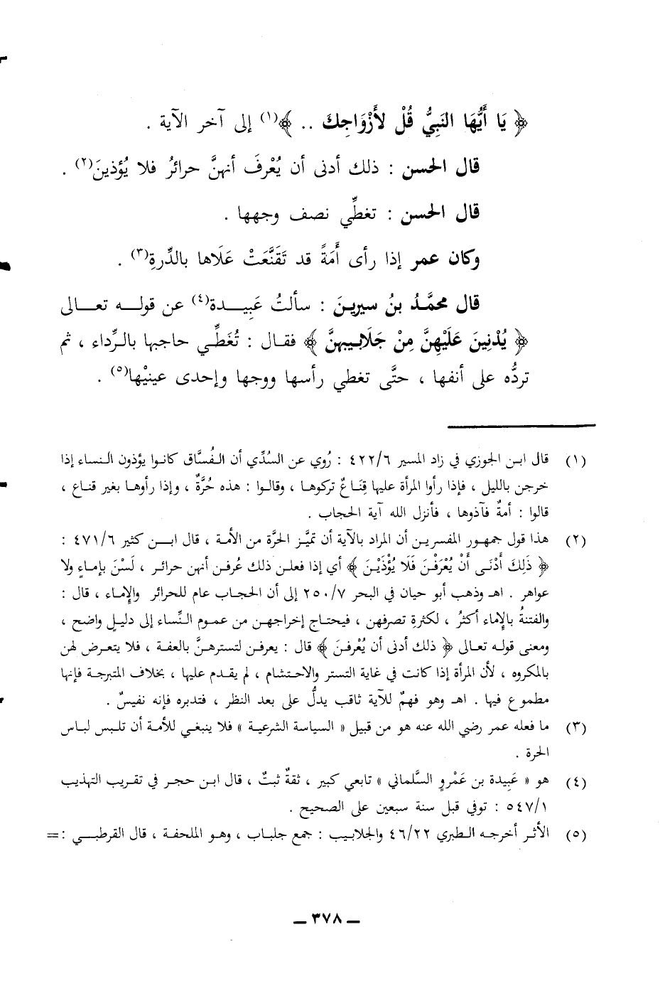 يا أيها النبي قل لأزواجك إلى آخر الآية قال الحسن ذلك أدني أن يعرف أنهن حرائر فلا يؤذين قال الحسن تغطي نصف وجهها وكان عمر إذا رأى أمة قد تقنعت علاها بالدرة قال محمد بن سيرين سألت عبيدة عن قوله تعالى يدنين عليهن من جلابيبهن فقال تغطي حاجبها بالرداء ثم ترده على أنفها حتى تغطي رأسها ووجهها وإحدى عينيها