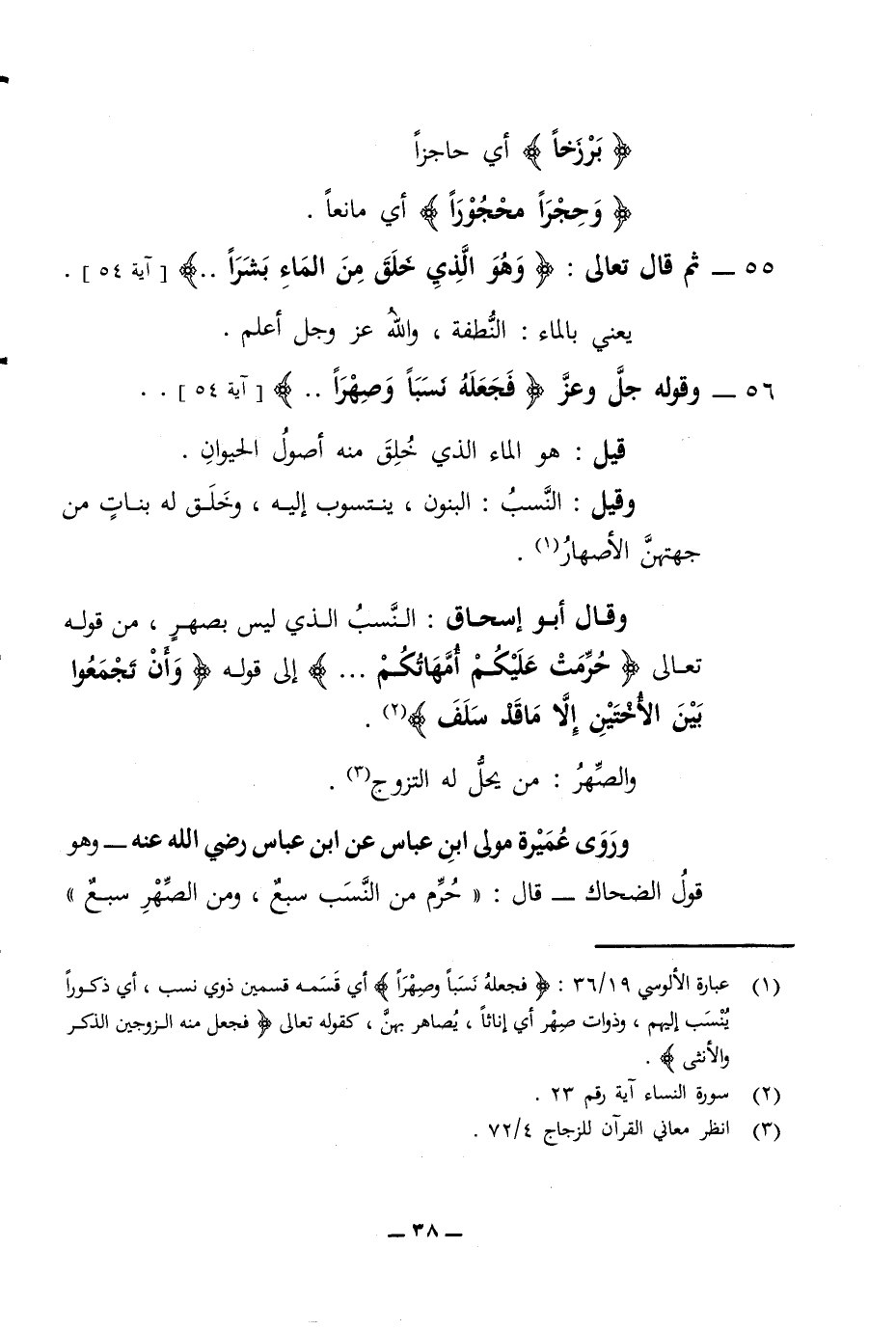 برزخا أي حاجزا وحجرا محجورا أي مانعا 55 - ثم قال تعالى وهو الذي خلق من الماء بشرا آية 54 يعني بالماء النطفة والله عز وجل أعلم 56 - وقوله جل وعز فجعله نسبا وصهرا آية 54 قيل هو الماء الذي خلق منه أصول الحيوان وقيل النسب البنون ينتسوب كان إليه وخلق له بنات من جهتهن الأصهار وقال أبو إسحاق النسب الذي ليس بصهر من قوله تعالى حرمت عليكم أمهاتكم إلى قوله وأن تجمعوا