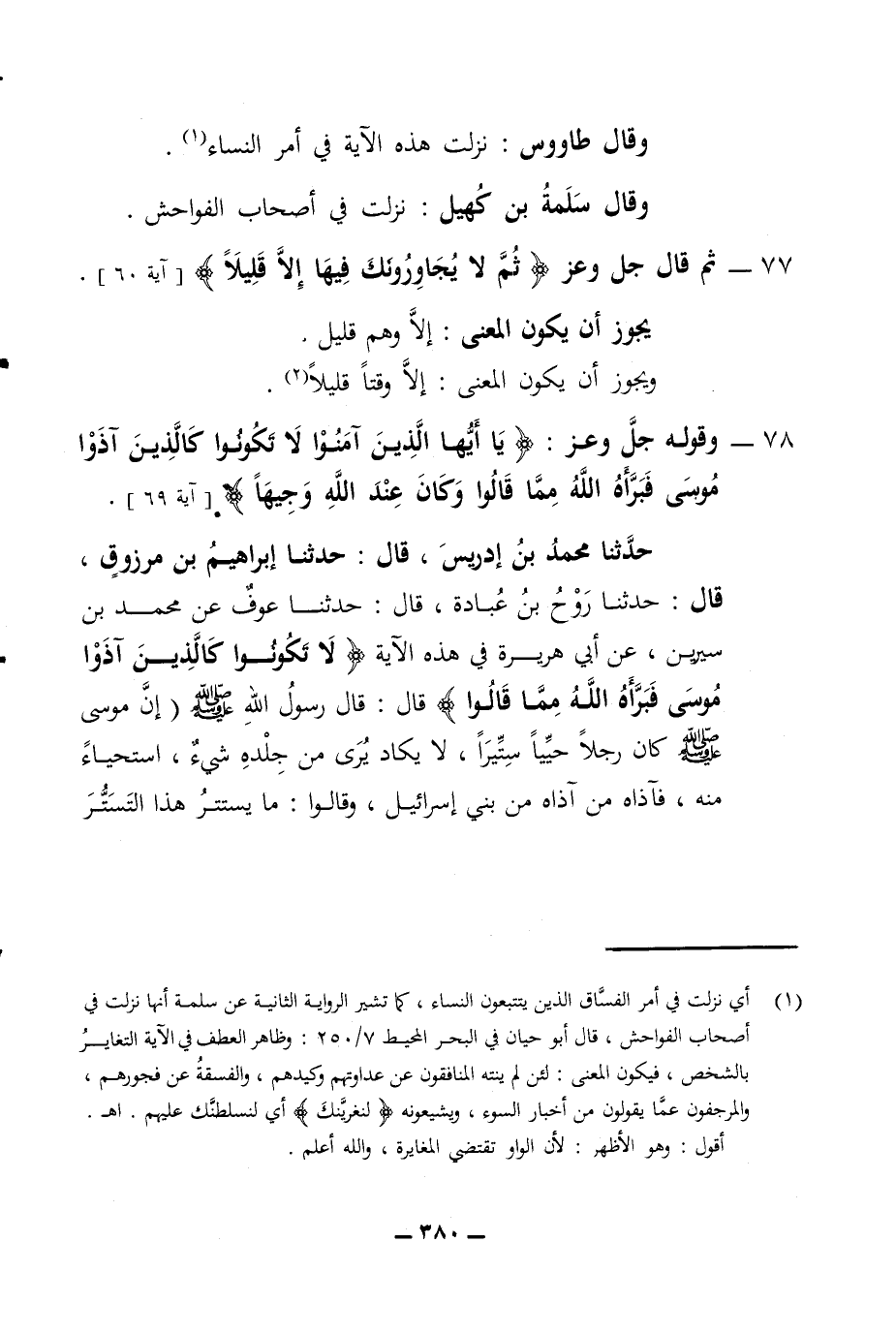 وقال طاووس نزلت هذه الآية في أمر النساء وقال سلمة بن كهيل نزلت في أصحاب الفواحش 77 - ثم قال جل وعز ثم لا يجاورونك فيها إلا قليلا آية 60 يجوز أن يكون المعنى إلا وهم قليل ويجوز أن يكون المعنى إلا وقتا قليلا