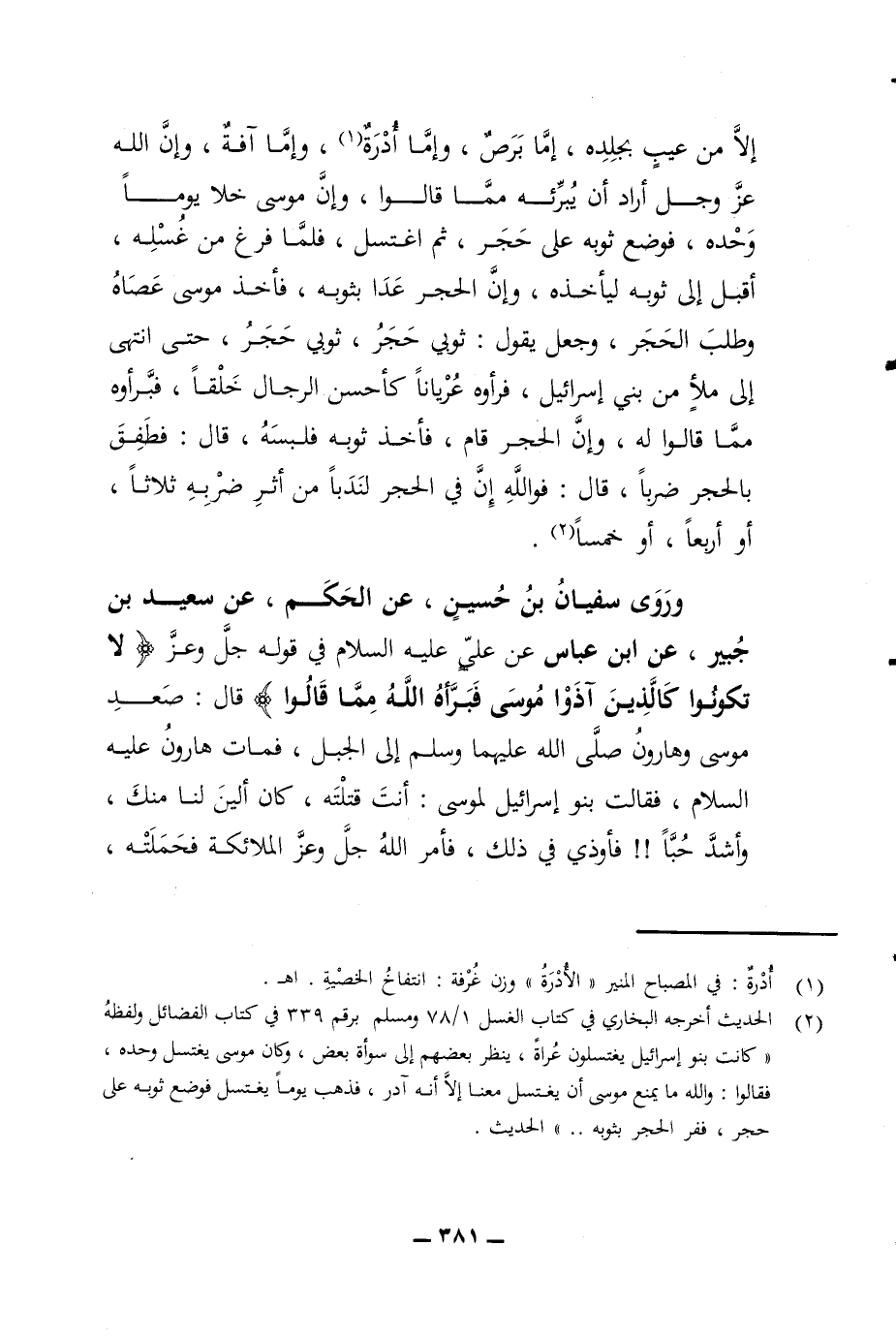إلا من عيب بجلده إما برص وإما أدرة وإما آفة وإن الله عز وجل أراد أن يبرئه مما قالوا وإن موسى خلا يوما وحده فوضع ثوبه على حجر ثم اغتسل فلما فرغ من غسله أقبل إلى ثوبه ليأخذه وإن الحجر عدا بثوبه فأخذ موسى عصاه وطلب الحجر وجعل يقول ثوبي حجر ثوبي حجر حتى انتهى إلى ملأ من بني إسرائيل فرأوه عريانا كأحسن الرجال خلقا فبرأوه كما مما قالوا له وإن الحجر قام فأخذ ثوبه فلبسه قال فطفق بالحجر ضربا قال فوالله إن في الحجر لندبا من أثر ضربه ثلاثا أو أربعا أو خمسا وروى سفيان بن حسين عن الحكم عن سعيد بن جبير عن ابن عباس عن علي عليه السلام في قوله جل وعز لا تكونوا كالذين آذوا موسى فبرأه الله مما قالوا قال صعد موسى وهارون صلى الله عليهما وسلم إلى الجبل فمات هارون عليه