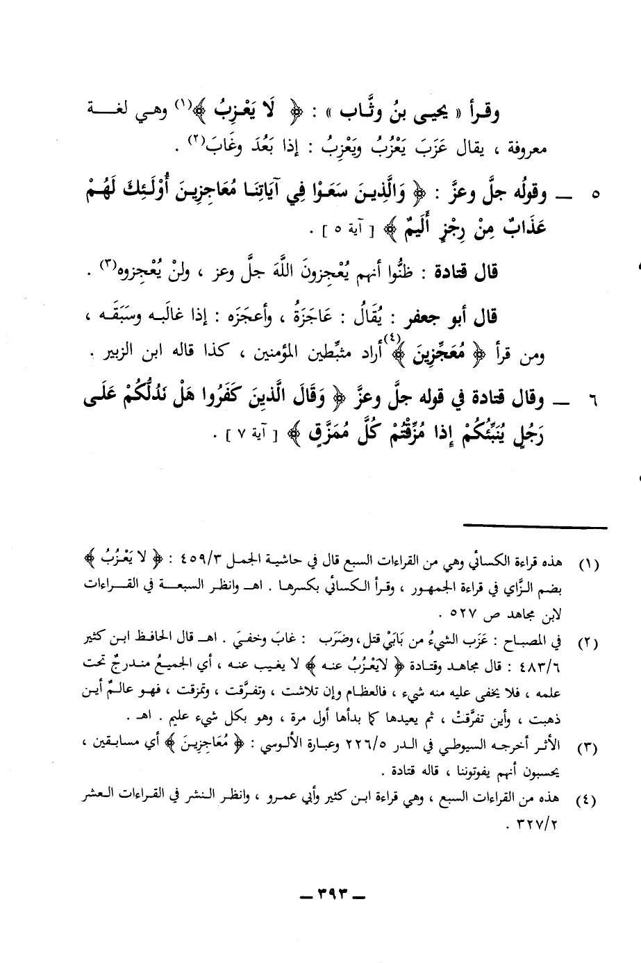 وقرأ يحيى بن وثاب لا يعزب وهي لغة معروفة يقال عزب يعزب ويعزب إذا بعد وغاب 5 - وقوله جل وعز والذين سعوا في آياتنا معاجزين أولئك لهم عذاب من رجز أليم آية 5 قال قتادة ظنوا أنهم يعجزون الله جل وعز ولن يعجزوه قال أبو جعفر يقال عاجزة وأعجزه إذا غالبه وسبقه ومن قرأ معجزين أراد مثبطين المؤمنين كذا قاله ابن الزبير 6 - وقال قتادة في قوله جل وعز وقال الذين كفروا هل ندلكم على رجل ينبئكم إذا مزقتم كل ممزق آية 7