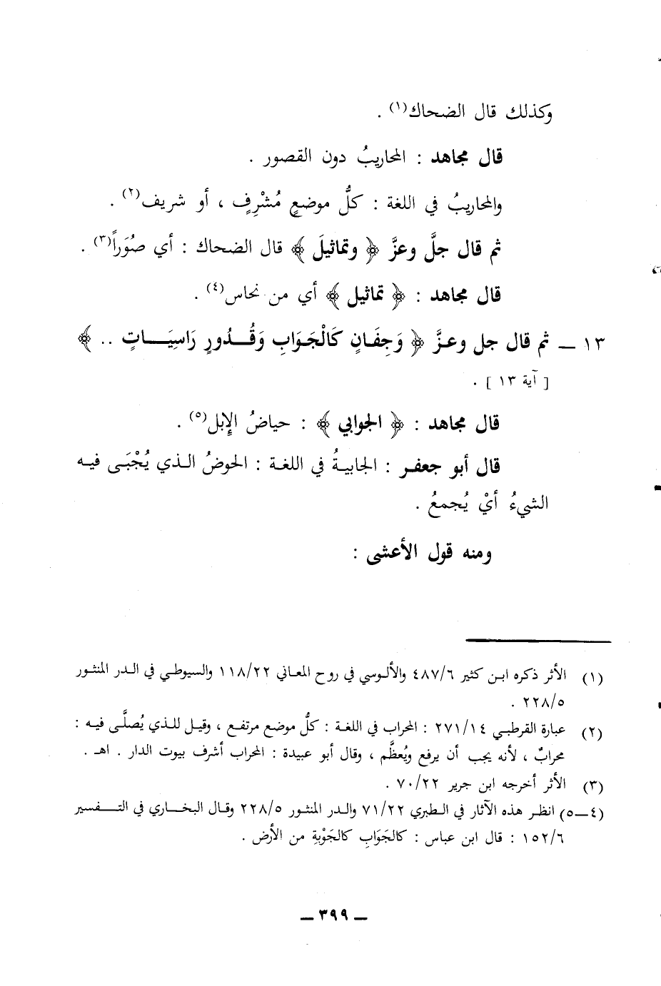 وكذلك قال الضحاك قال مجاهد المحاريب دون القصور والمحاريب في اللغة كل موضع مشرف أو شريف ثم قال جل وعز وتماثيل قال الضحاك أي صورا قال مجاهد تماثيل أي من نحاس 13 - ثم قال جل وعز وجفان كالجواب وقدور راسيات قال مجاهد الجوابي حياض الإبل قال أبو جعفر الجابية في اللغة الحوض الذي يجبى فيه الشئ أي يجمع ومنه قول الأعشى