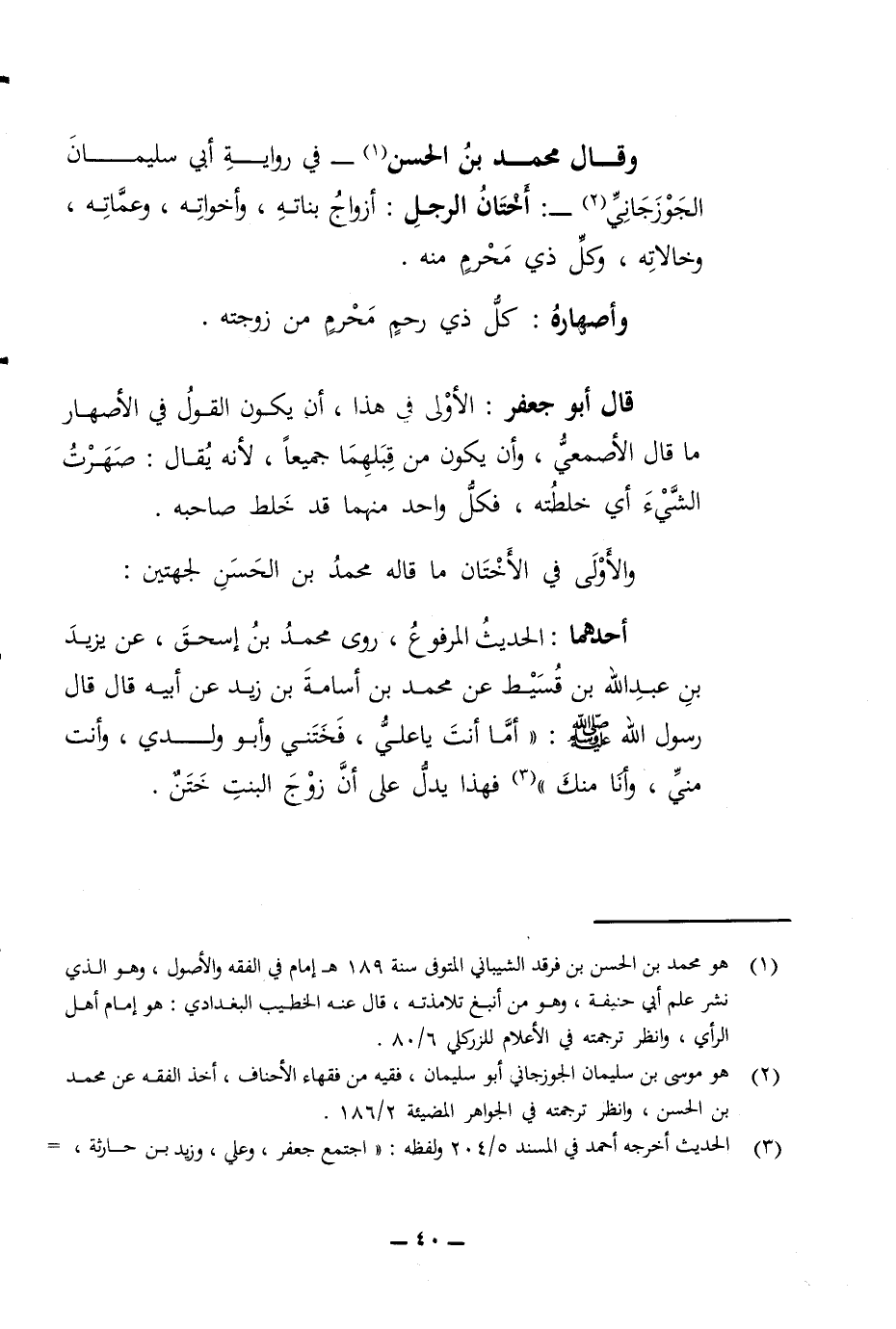 وقال محمد بن الحسن في رواية أبي سليمان الجوزجاني أختان الرجل أزواج بناته وأخواته وعماته وخالاته وكل ذي محرم منه اصهاره كل ذي رحم محرم من زوجته قال أبو جعفر الأولى في هذا أن يكون القول في الأصهار