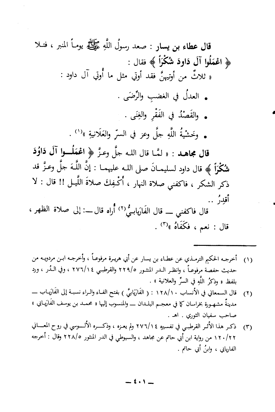 قال عطاء بن يسار صعد رسول الله صلى الله عليه وسلم يوما المنبر فتلا اعملوا آل داود شكرا فقال ثلاث من أوتيهن فقد أوتي مثل ما أوتي آل داود والعدل في الغضب والرضى والقصد في الفقر والغنى وخشية الله جل وعز في السر والعلانية قال مجاهد لما قال الله جل وعز اعملوا آل داود شكرا قال داود لسليمان صلى الله عليهما إن الله جل وعز قد ذكر الشكر فاكفني صلاة النهار أكفك صلاة الليل قال لا أقدر قال فاكفني قال الفاريابي أراه قال إلى صلاة الظهر قال نعم فكفاه