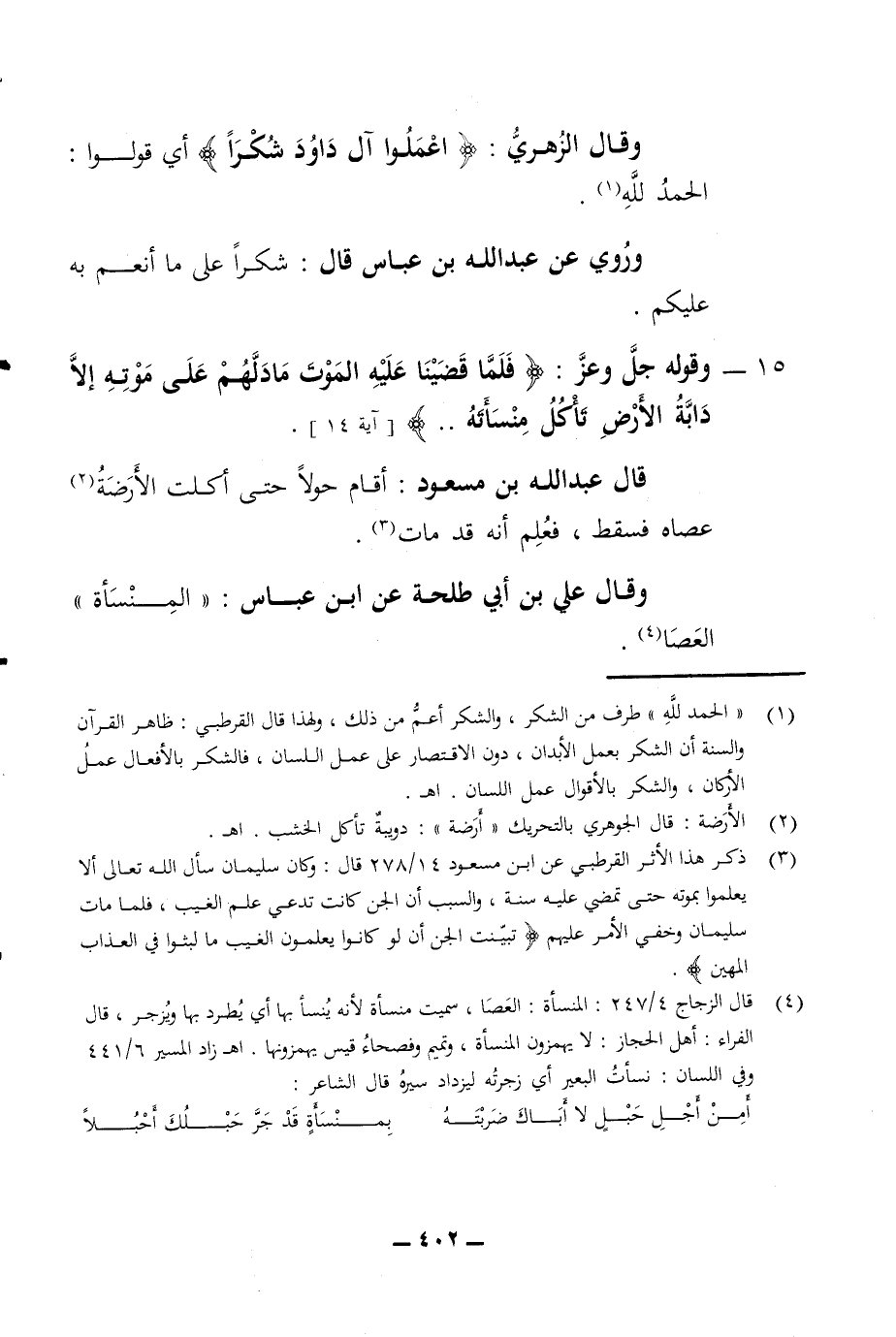 15 - وقوله جل وعز فلما قضينا عليه الموت ما دلهم على موته إلا دابة الأرض تأكل منسأته آية 14 قال عبد الله بن مسعود أقام حولا حتى أكلت الأرضة عصاه فسقط فعلم أنه قد مات وقال علي بن أبي طلحة عن ابن عباس المنسأة العصا