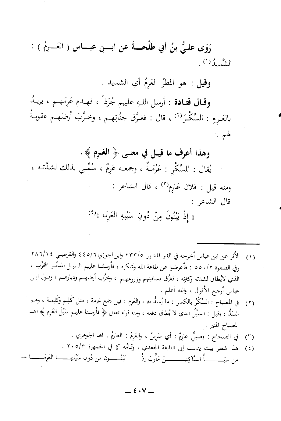 روى علي بن أبي طلحة عن ابن عباس العرم الشديد وقيل هو المطر العرم أي الشديد وقال قتادة أرسل الله عليهم جرذا فهدم عرمهم يريد بالعرم السكر قال فغرق جناتهم وخرب أرضهم عقوبة لهم وهذا أعرف ما قيل في معنى العرم يقال للسكر عرمة وجمعه عرم سمي بذلك لشدته ومنه قيل فلان عارم قال الشاعر إذ يبنون من دون سيله العرما