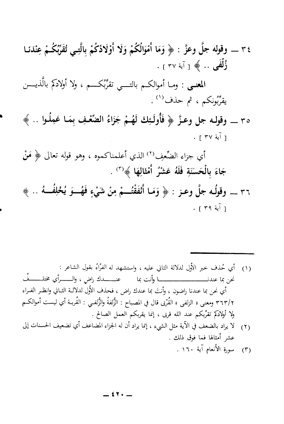 34 - وقوله جل وعز وما أموالكم ولا أولادكم بالتي تقربكم عندنا زلفى المعنى وما أموالكم بالتي تقربكم ولا أولادكم بالذين يقربونكم ثم حذف 35 - وقوله جل وعز فأولئك لهم جزاء الضعف بما عملوا