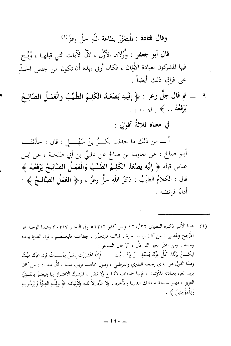 وقال قتادة فليتعزز بطاعة الله جل وعز قال أبو جعفر وأولاها الأول لأن الآيات التي قبلها وبخ فيها المشركون بعبادة الأوثان فكان أولى بهذه أن تكون من جنس الحث على فراق ذلك أيضا 9 - ثم قال جل وعز إليه يصعد الكلم الطيب والعمل الصالح يرفعه آية 10 في معناه ثلاثة أقوال أ - من ذلك ما حدثنا بكر بن سهل قال حدثنا أبو صالح عن معاوية بن صالح عن علي بن أبي طلحة عن ابن عباس قوله إليه يصعد الكلم الطيب والعمل الصالح يرفعه قال الكلام الطيب ذكر الله جل وعز والعمل الصالح أداء فرائضه