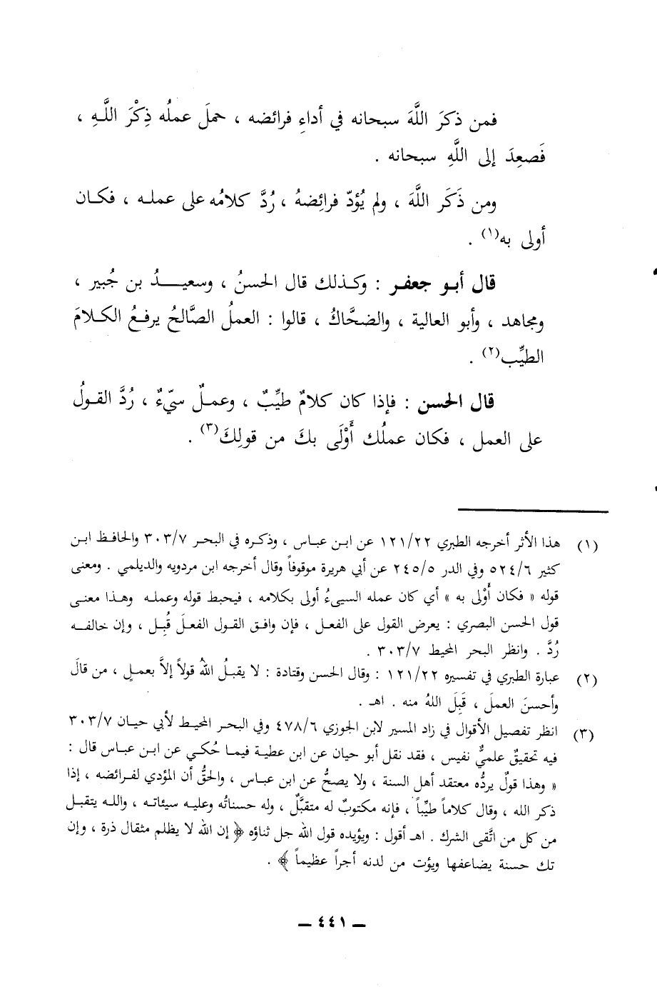 فمن ذكر الله سبحانه في أداء فرائضه حمل عمله ذكر الله فصعد إلى الله سبحانه ومن ذكر الله ولم يؤد فرائضه رد كلامه على عمله فكان أولى به قال أبو جعفر وكذلك قال الحسن وسعيد بن جبير ومجاهد وأبو العالية والضحاك قالوا العمل الصالح يرفع الكلام الطيب قال الحسن فإذا كان كلام طيب وعمل سئ رد القول