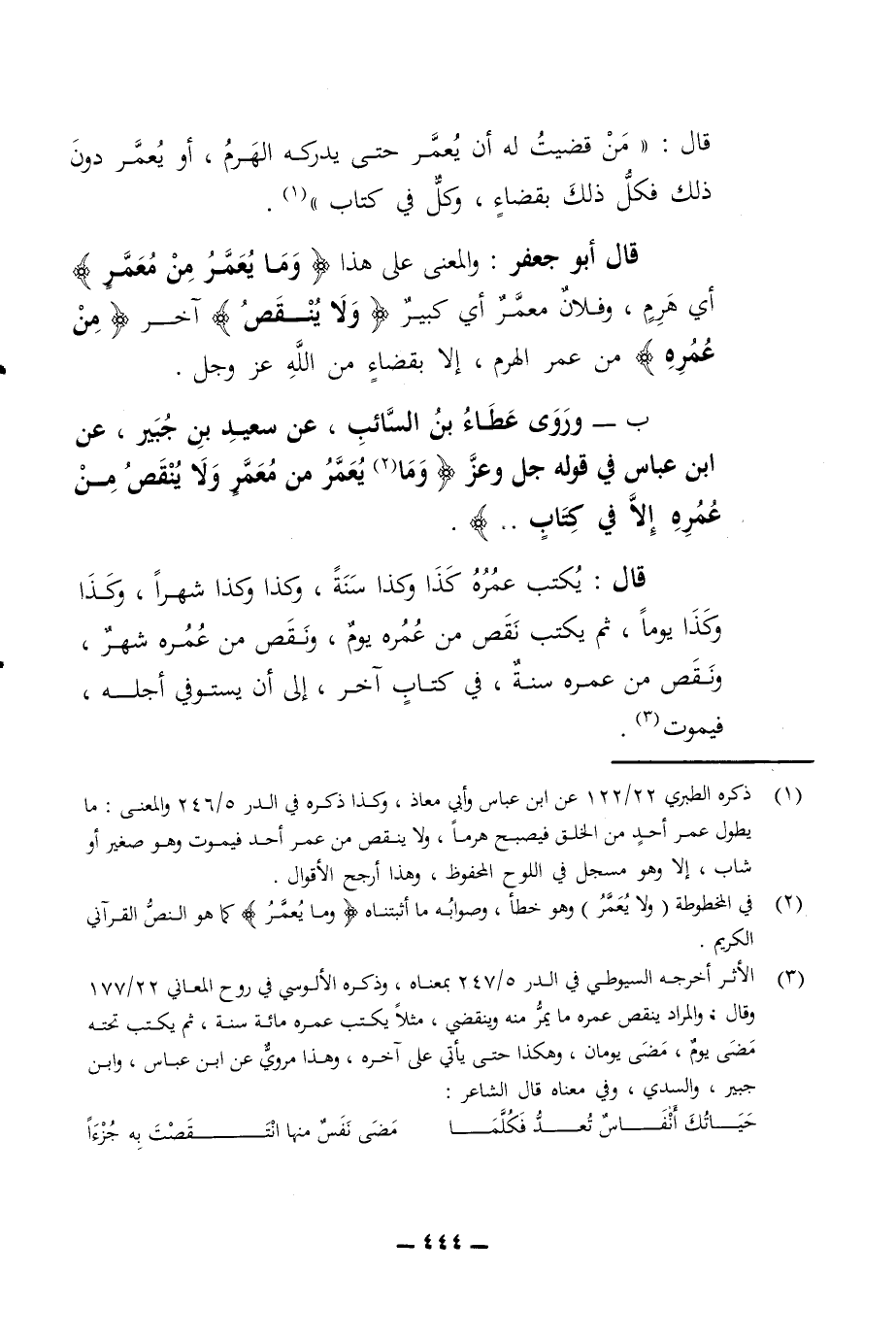 قال من قضيت له أن يعمر حتى يدركه الهرم أو يعمر دون ذلك فكل ذلك بقضاء وكل في كتاب قال أبو جعفر والمعنى على هذا وما يعمر من معمر أي هرم وفلان معمر أي كبير ولا ينقص آخر من عمره من عمر الهرم إلا بقضاء من الله عز وجل ب - وروى عطاء بن السائب عن سعيد بن جبير عن ابن عباس في قوله جل وعز وما يعمر من معمر ولا ينقص من عمره إلا في كتاب قال يكتب عمره كذا وكذا سنة وكذا وكذا شهر وكذا وكذا يوما ثم يكتب نقص من عمره يوم ونقص من عمره شهر ونقص من عمره سنة في كتاب آخر إلى أن يستوفي أجله فيموت