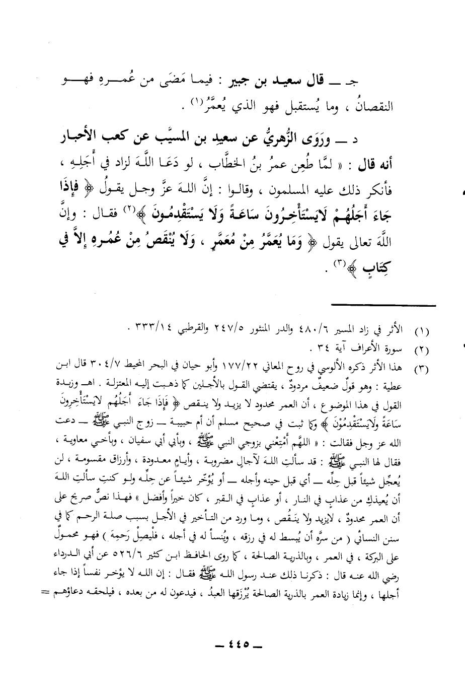 د - وروى الزهري عن سعيد بن المسيب عن كعب الأحبار أنه قال لما طعن عمر بن الخطاب لو دعا الله لزاد في أجله فأنكر ذلك عليه المسلمون وقالوا إن الله عز وجل يقول فإذا جاء أجلهم لا يستأخرون ساعة ولا يستقدمون فقال وإن الله تعالى يقول وما يعمر من معمر ولا ينقص من عمره إلا في كتاب