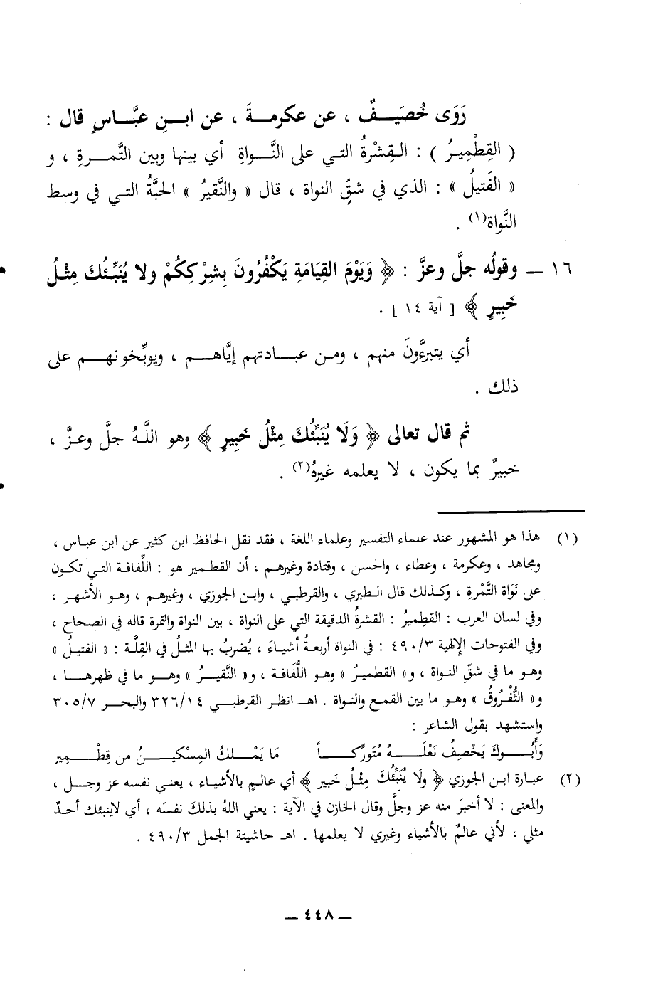 روى خصيف عن عكرمة عن ابن عباس قال القطمير القشرة التي على النواة أي بينها وبين التمرة والفتيل الذي في شق النواة قال والنقير الحبة التي في وسط النواة 16 - وقوله جل وعز ويوم القيامة يكفرون بشرككم ولا ينتئك مثل خبير آية 14 أي يتبرءون منهم ومن عبادتهم إياهم ويوبخونهم على ذلك ثم قال تعالى ولا ينبئك مثل خبير وهو الله جل وعز خبير بما يكون لا يعلمه غيره