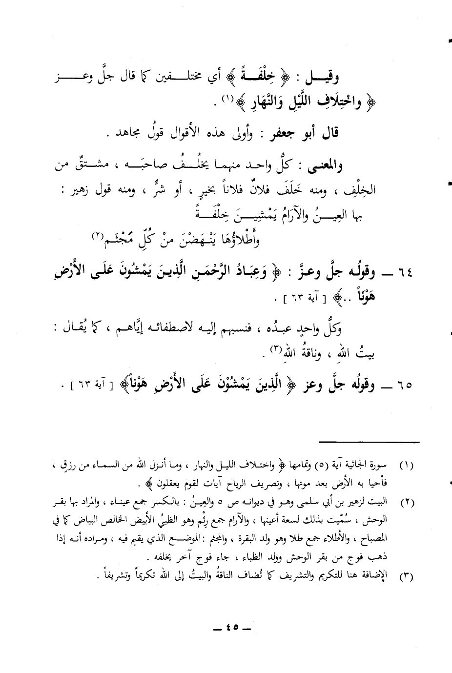 وقيل خلفة أي مختلفين كما قال جل وعز واختلاف الليل والنهار قال أبو جعفر وأولى هذه الأقوال قول مجاهد والمعنى كل واحد منهما يخلف صاحبه مشتق من الخلف ومنه خلف فلان فلانا بخير أو شر ومنه قول زهير بها العين والآرام يمشين خلفة وأطلاؤها ينهضن من كل مجثم 64 - وقوله جل وعز وعباد الرحمن الذين يمشون على الأرض