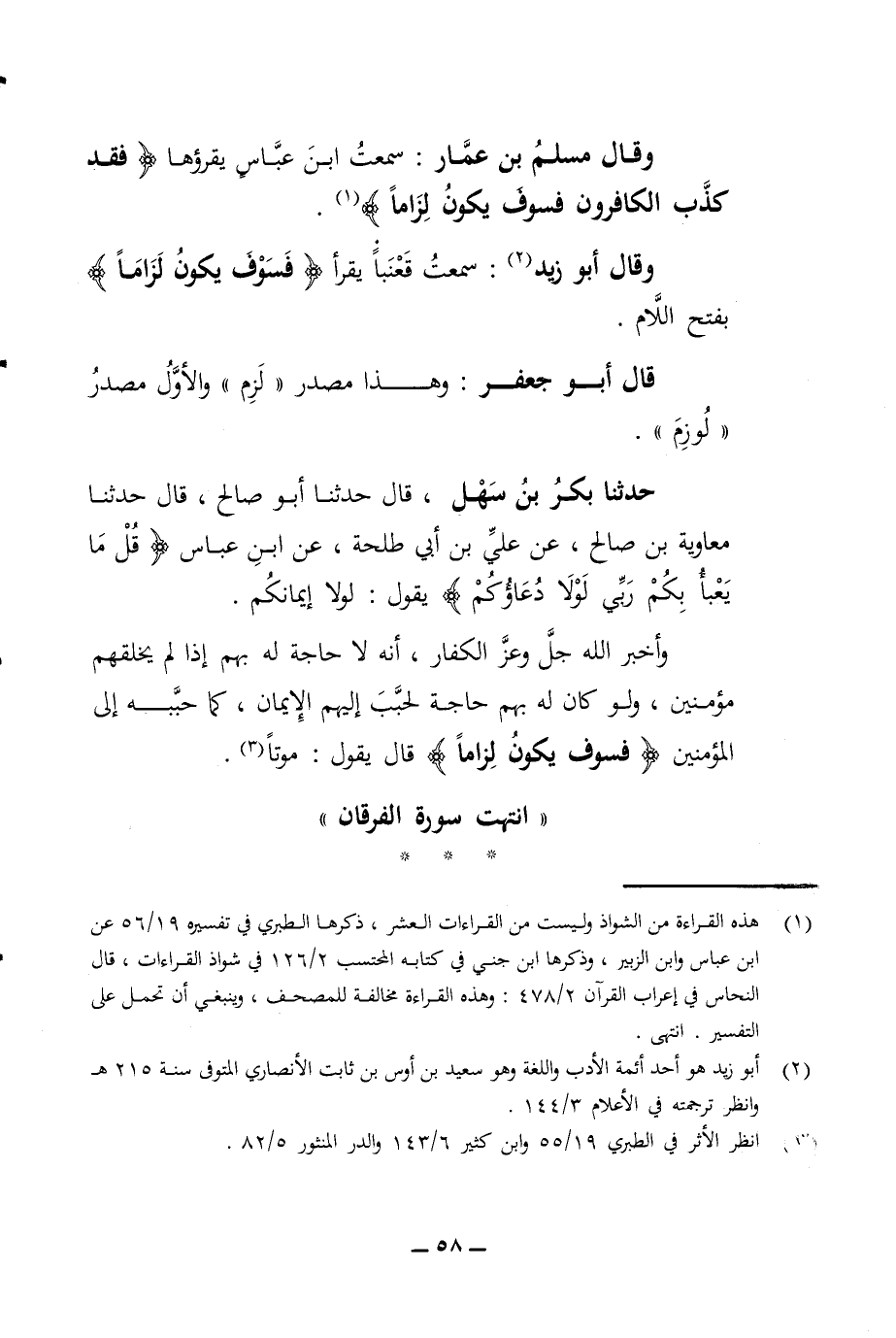 كذب الكافرون فسوف يكون لزاما وقال أبو زيد سمعت قعنبا يقرأ فسوف يكون لزاما بفتح اللام قال أبو جعفر وهذا مصدر لزم والأول مصدر لوزم حدثنا بكر بن سهل قال حدثنا أبو صالح قال حدثنا معاوية بن صالح عن علي بن أبي طلحة عن ابن عباس قل ما يعبأ بكم ربي لولا دعاؤكم يقول لولا إيمانكم وأخبر الله جل وعز الكفار أنه لا حاجة له بهم إذا لم يخلقهم مؤمنين ولو كان له بهم حاجة لحبب إليهم الإيمان كما حببه إلى المؤمنين فسوف يكون لزاما قال يقول موتا انتهت سورة الفرقان