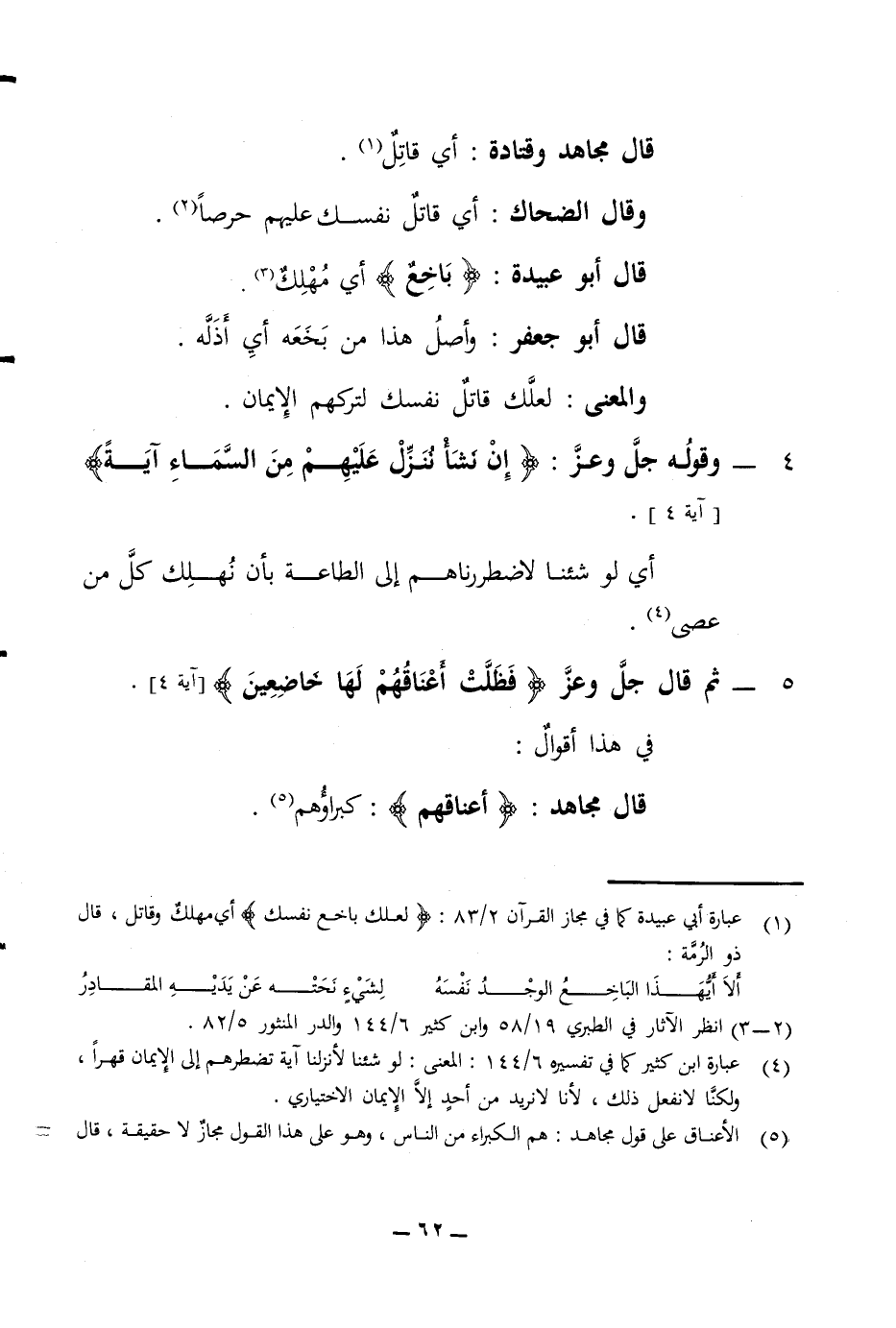 قال مجاهد وقتادة أي قاتل وقال الضحاك أي قاتل نفسك عليهم حرصا قال أبو عبيدة باخع أي مهلك قال أبو جعفر وأصل هذا من بخعه عبد أي أذله والمعنى لعلك قاتل نفسك لتركهم الإيمان 4 - وقوله جل وعز إن نشأ ننزل عليهم من السماء آية آية 4 أي لو شئنا لاضطررناهم عليه إلى الطاعة بأن نهلك كل من عصى 5 - ثم قال جل وعز فظلت أعناقهم لها خاضعين آية 4 في هذا أقوال قال مجاهد أعناقهم كبراؤهم