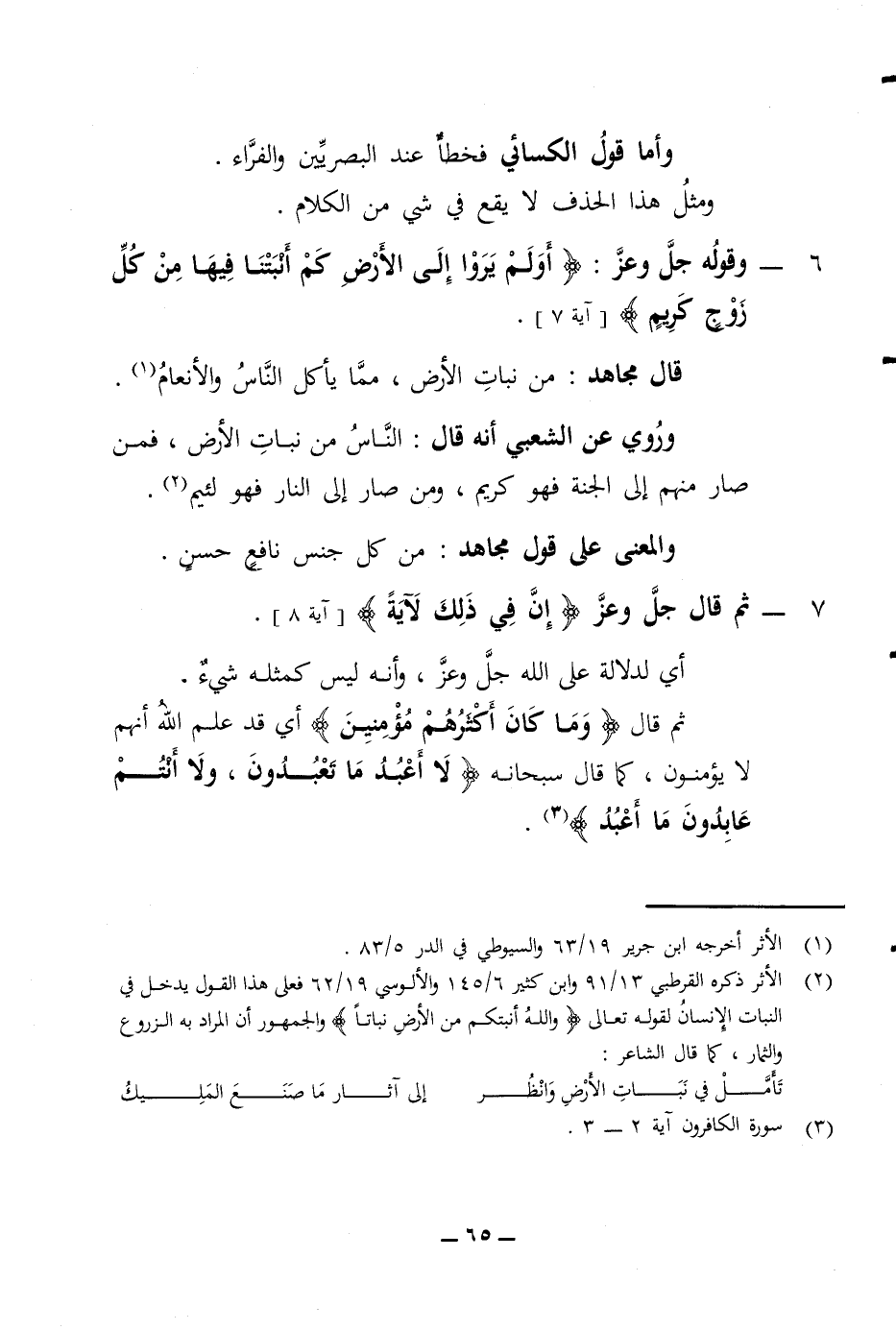 وأما قول الكسائي فخطأ عند البصريين والفراء ومثل هذا الحذف لا يقع في شئ من الكلام 65 - وقوله جل وعز أولم يروا إلى الأرض كم أنبتنا فيها من كل