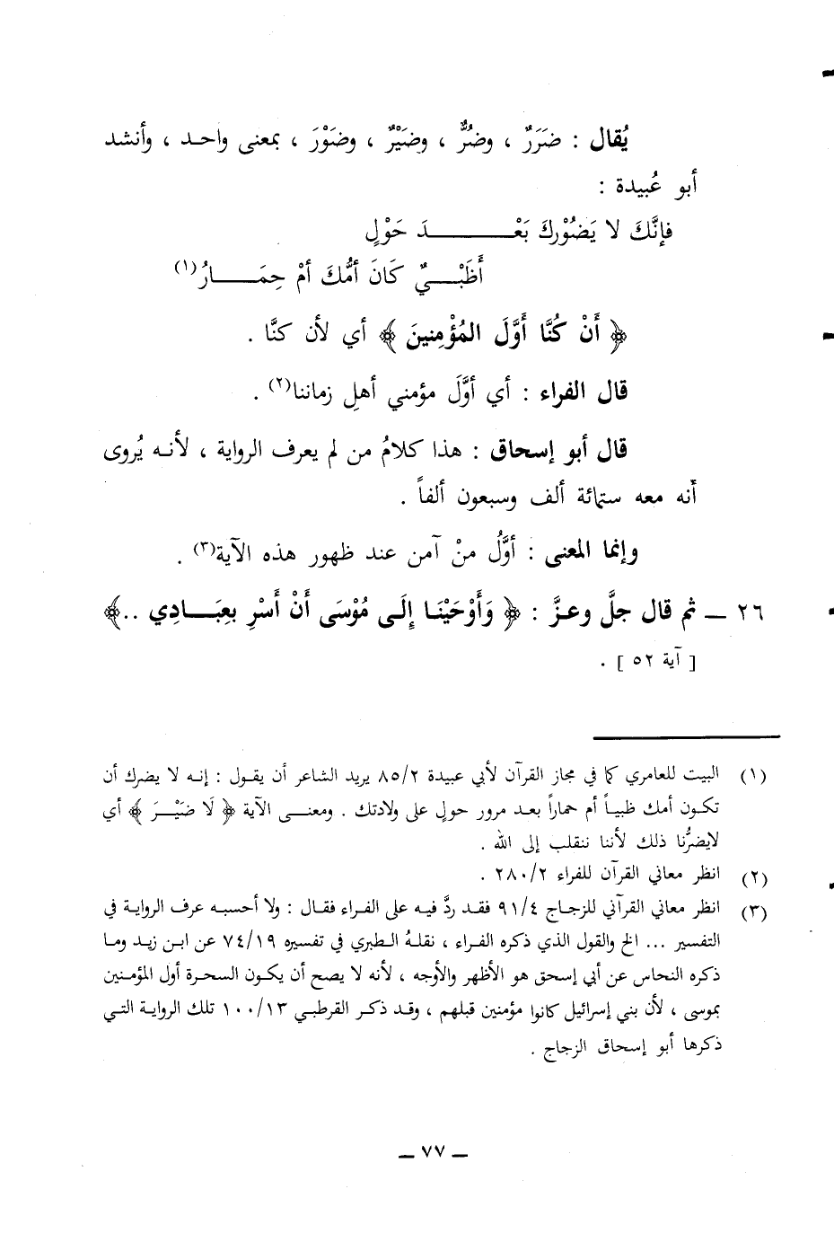 يقال ضرر وضر وضير وضور بمعنى واحد وأنشد أبو عبيده فإنك لا يضورك بعد حول أظبي كان أمك أم حمار أن كنا أول المؤمنين أي لأن كنا قال الفراء أي أول مؤمني أهل زماننا قال أبو إسحاق هذا كلام من لم يعرف الرواية لأنه يروى أنه معه ستمائة ألف وسبعون ألفا وإنما المعنى أول من آمن عند ظهور هذه الآية 26 - ثم قال جل وعز وأوحينا إلى موسى أن أسر بعبادي آية 52