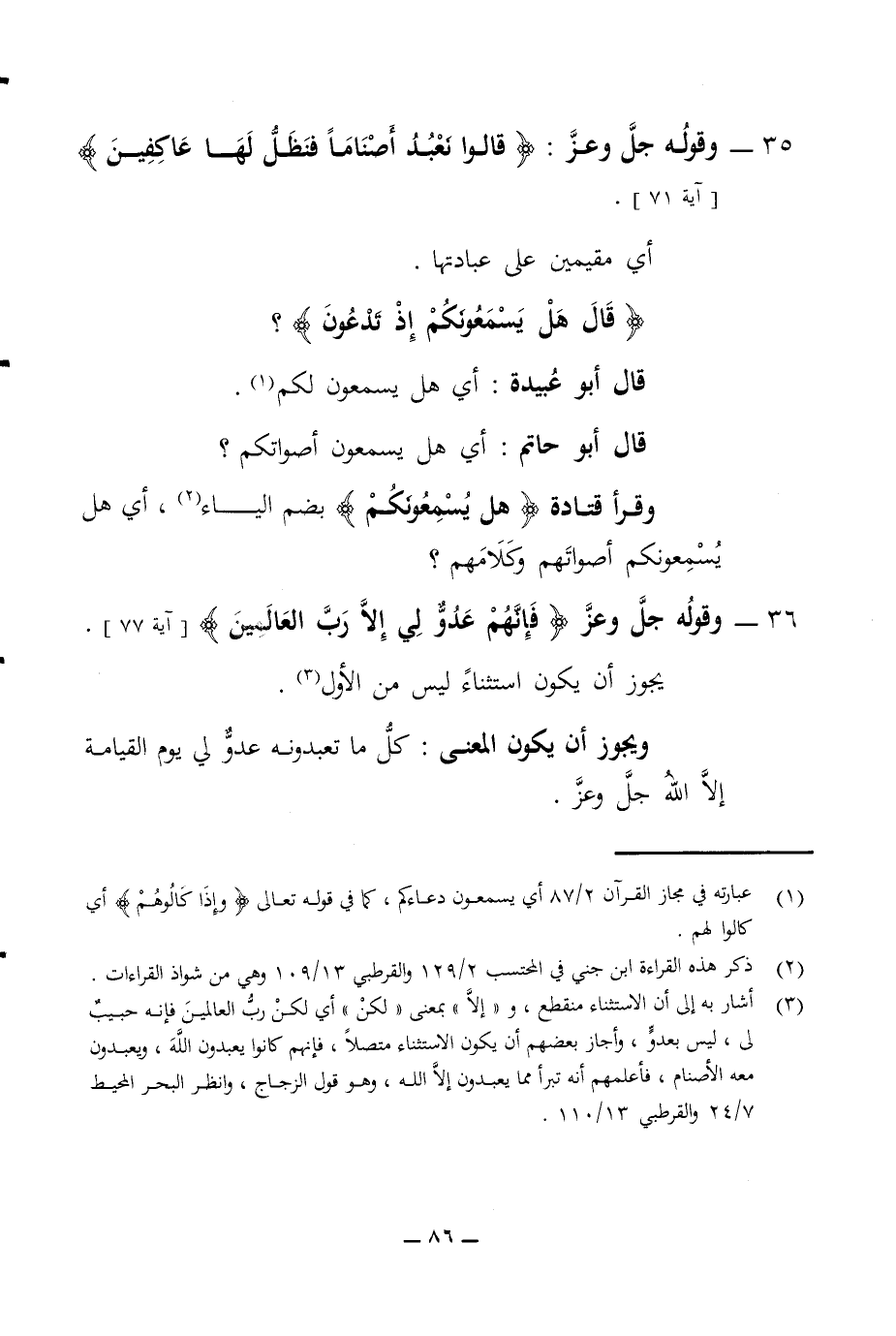 35 - وقوله جل وعز قالوا نعبد أصناما فنظل لها عاكفين آية 71 أي مقيمين على عبادتها قال هل يسمعونكم إذ تدعون قال أبو عبيدة أي هل يسمعون لكم قال أبو حاتم أي هل يسمعون أصواتكم وقرأ قتادة هل يسمعونكم بضم الياء أي هل يسمعونكم أصواتهم وكلامهم 36 - وقوله جل وعز فإنهم عدو لي إلا رب العالمين آية 77
