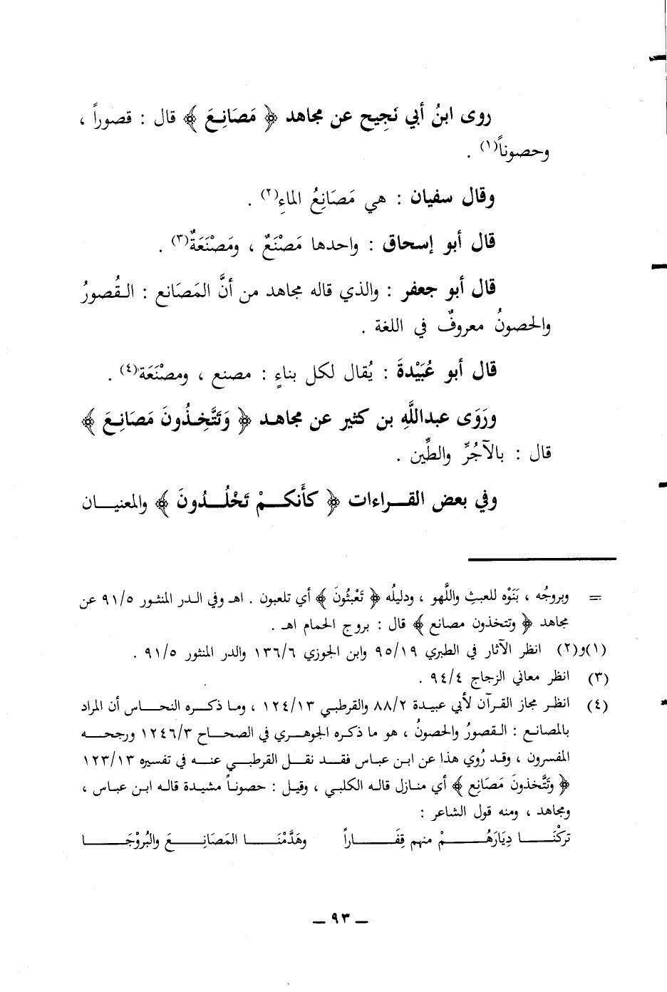 روى ابن أبي نجيح عن مجاهد مصانع قال قصورا وحصونا وقال سفيان هي مصانع الماء قال أبو إسحاق واحدها مصنع ومصنعة قال أبو جعفر والذي قاله مجاهد من أن المصانع القصور والحصون معروف في اللغة قال أبو عبيدة يقال لكل بناء مصنع ومصنعة وروى عبد الله بن كثير عن مجاهد وتتخذون مصانع