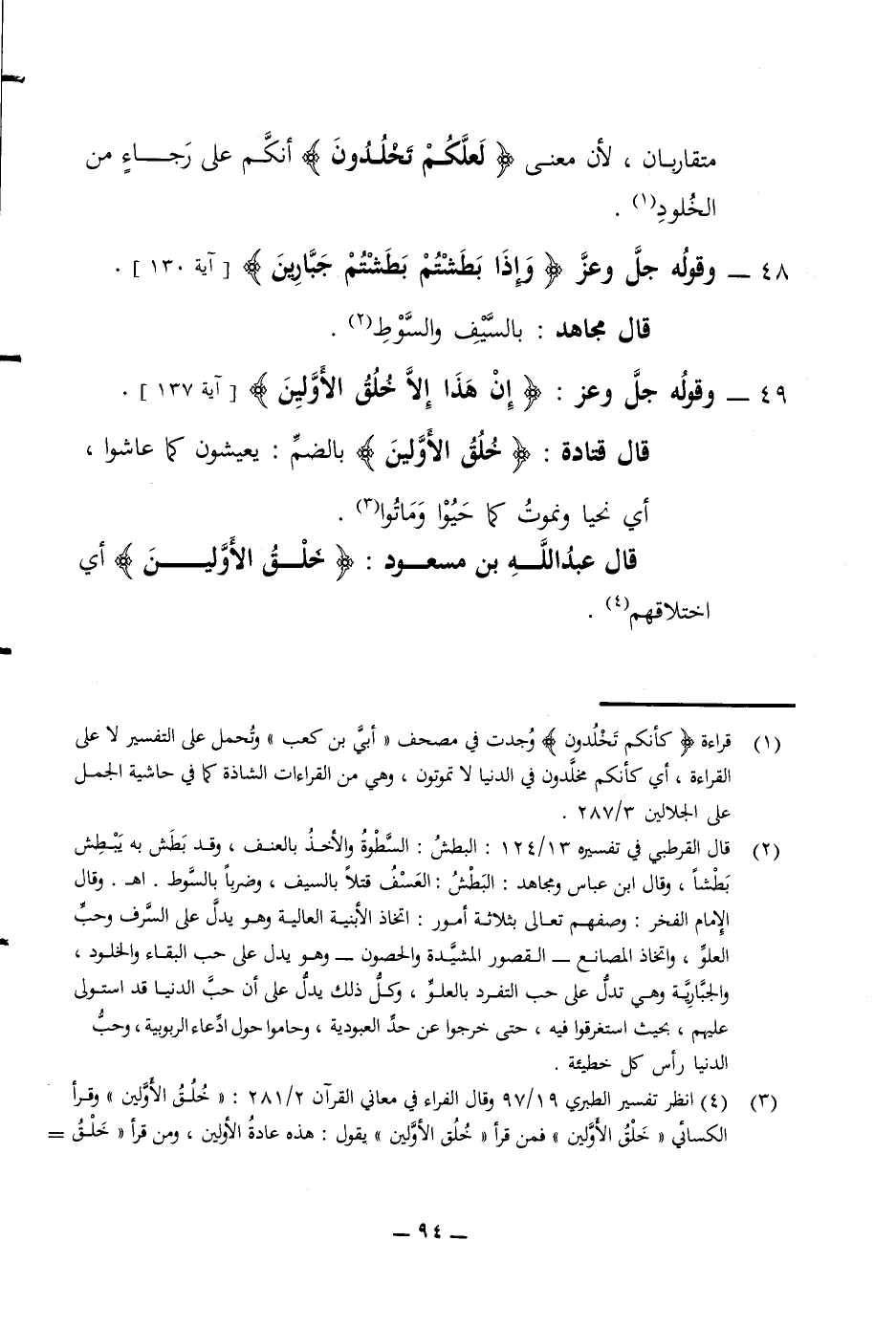 متقاربان لأن معنى لعلكم تخلدون أنكم على رجاء من الخلود 48 - وقوله جل وعز وإذا بطشتم بطشتم جبارين آية 130 قال مجاهد بالسيف والسوط 49 - وقوله جل وعز إن هذا إلا خلق الأولين آية 137 قال قتادة خلق الأولين بالضم يعيشون كما عاشوا أي نحيا ونموت كما حيوا وماتوا قال عبد الله بن مسعود خلق الأولين أي اختلاقهم