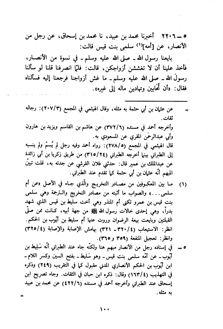 2206- أَخْبَرَنَا مُحَمَّدُ بْنُ عُبَيْدٍ ، حَدَّثَنَا مُحَمَّدُ بْنُ إِسْحَاقَ ، عَنْ رَجُلٍ مِنَ الأَنْصَارِ ، عَنْ [أُمِّهِ] (1)سَلْمَى بِنْتِ قَيْسٍ قَالَتْ : بَايَعْنَا رَسُولَ اللَّهِ صَلَّى اللَّهُ عَلَيْهِ وَسَلَّمَ فِي نِسْوَةٍ مِنَ الأَنْصَارِ , فَأَخَذَ عَلَيْنَا أَنْ لاَ تَغْشُشْنَ أَزْوَاجَكُنَّ , قَالَتْ : فَلَمَّا انْصَرَفْنَا قُلْنَا : لَوْ سَأَلْنَا رَسُولَ اللَّهِ صَلَّى اللَّهُ عَلَيْهِ وَسَلَّمَ مَا غِشُّ أَزْوَاجِنَا ، فَرَجَعْنَا إِلَيْهِ فَسَأَلْنَاهُ , فَقَالَ : أَنْ تُحَابِينَ وَتُهَادِينَ مَالَهُ إِلَى غَيْرِهِ.