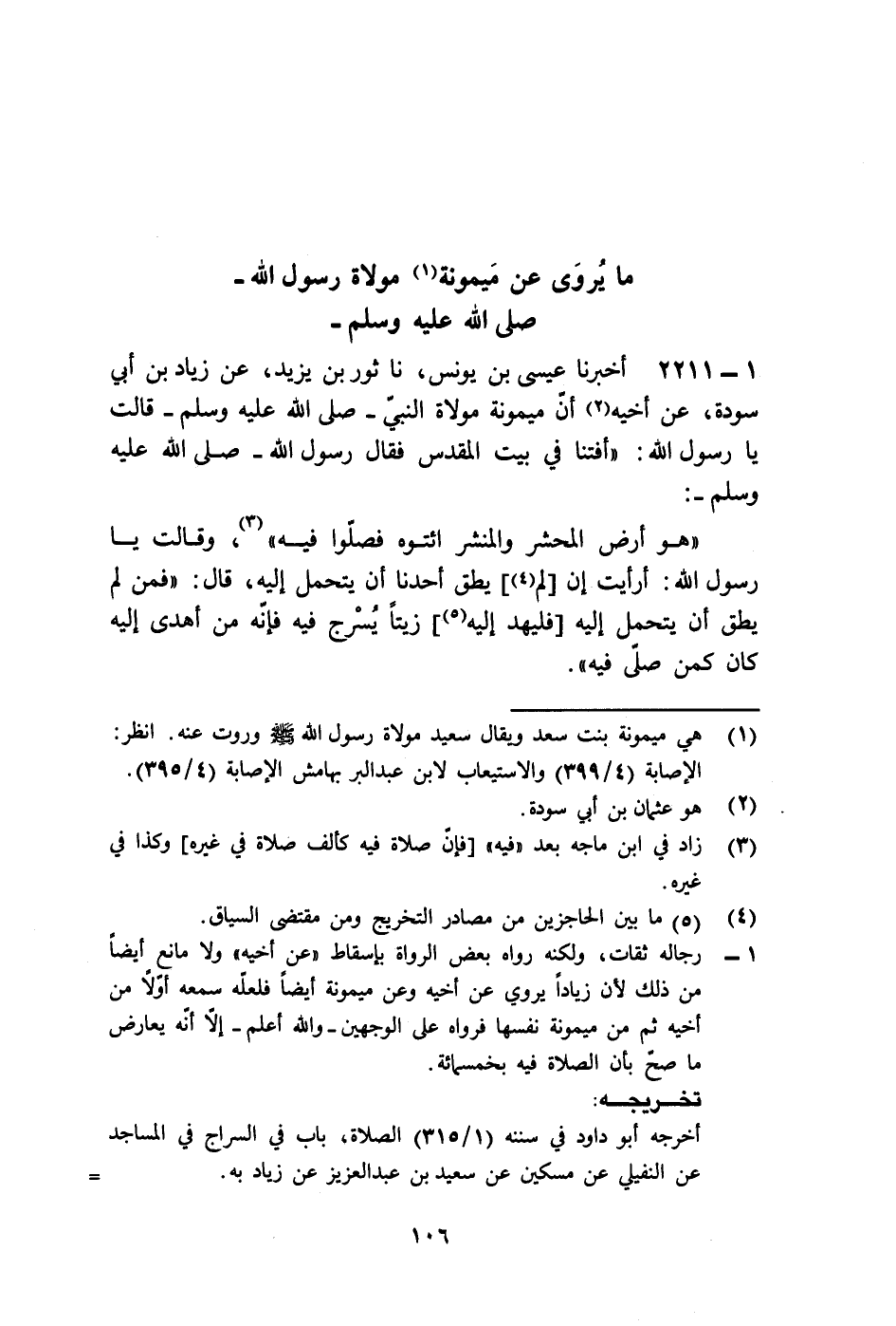 2211 - أَخْبَرَنَا عِيسَى بْنُ يُونُسَ، نا ثَوْرُ بْنُ يَزِيدَ، عَنْ زِيَادِ بْنِ أَبِي سَوْدَةَ، عَنْ أَخِيهِ، أَنَّ مَيْمُونَةَ - مَوْلَاةِ النَّبِيِّ صَلَّى اللهُ عَلَيْهِ وَسَلَّمَ قَالَتْ: يَا رَسُولَ اللَّهِ , أَفْتِنَا فِي بَيْتِ الْمَقْدِسِ , فَقَالَ رَسُولُ اللَّهِ صَلَّى اللهُ عَلَيْهِ وَسَلَّمَ: «§هُوَ أَرْضُ الْمَحْشَرِ وَالْمَنْشَرِ , ائْتُوهُ فَصَلُّوا فِيهِ» , وَقَالَتْ: يَا رَسُولَ اللَّهِ , أَرَأَيْتَ إِنْ لَمْ يُطِقْ أَحَدُنَا أَنْ يَتَحَمَّلَ إِلَيْهِ , قَالَ: «فَمَنْ لَمْ يُطِقْ أَنْ يَتَحَمَّلَ إِلَيْهِ , فَلْيُهْدِ إِلَيْهِ زَيْتًا يُسْرَجُ فِيهِ , فَإِنَّهُ مَنْ أَهْدَى إِلَيْهِ كَانَ كَمَنْ صَلَّى فِيهِ»