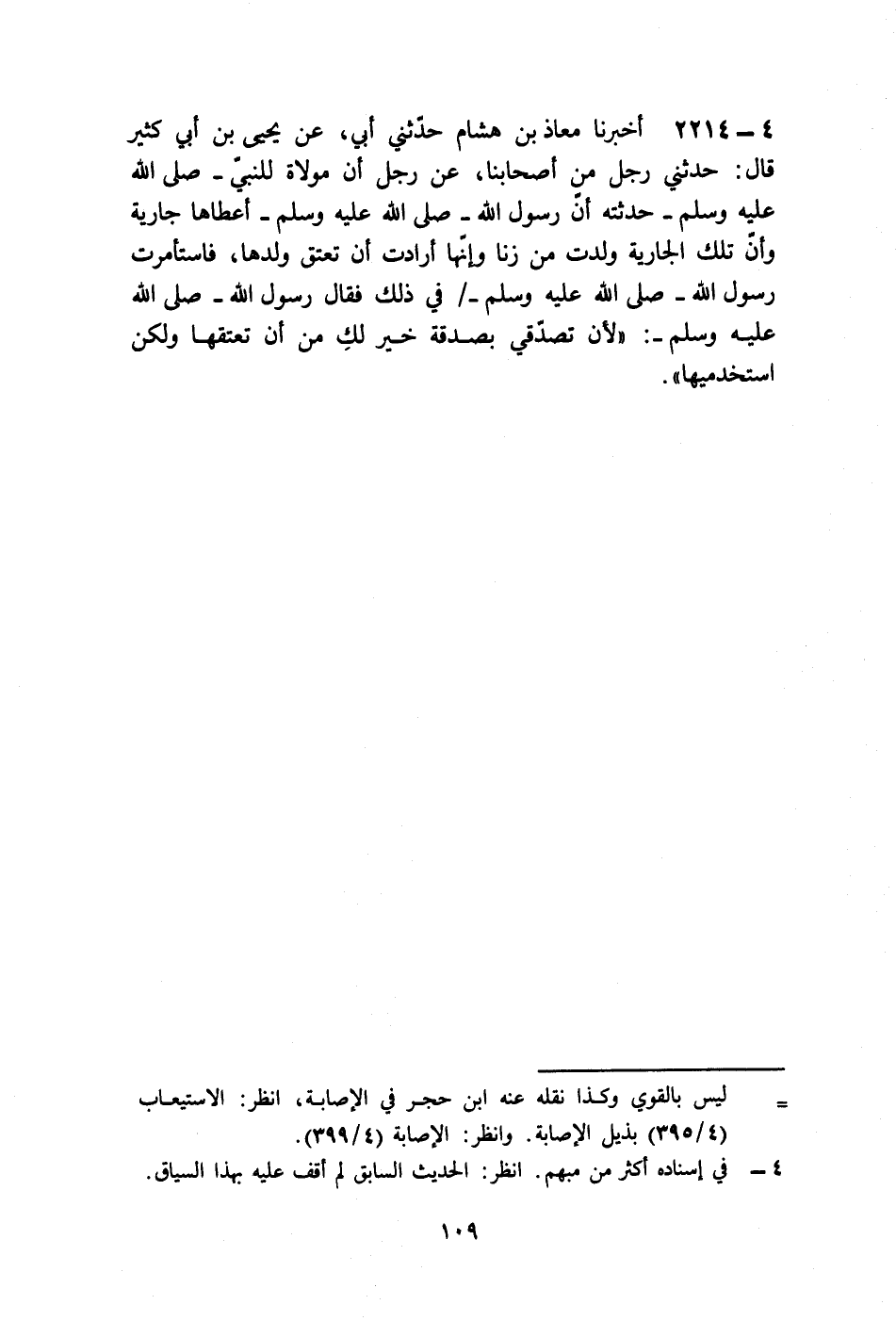 2214 - أَخْبَرَنَا مُعَاذُ بْنُ هِشَامٍ، حَدَّثَنِي أَبِي، عَنْ يَحْيَى بْنِ أَبِي كَثِيرٍ، قَالَ: حَدَّثَنِي رَجُلٌ مِنْ أَصْحَابِنَا، عَنْ رَجُلٍ، أَنَّ مَوْلَاةً لِلنَّبِيِّ صَلَّى اللهُ عَلَيْهِ وَسَلَّمَ حَدَّثَتْهُ أَنَّ رَسُولَ اللَّهِ صَلَّى اللهُ عَلَيْهِ وَسَلَّمَ أَعْطَاهَا جَارِيَةً وَأَنَّ تِلْكَ الْجَارِيَةَ وَلَدَتْ مِنْ زِنًا , وَإِنَّهَا أَرَادَتْ أَنْ تَعْتَقَ وَلَدَهَا , فَاسْتَأْمَرَتْ رَسُولَ اللَّهِ صَلَّى اللهُ عَلَيْهِ وَسَلَّمَ فِي ذَلِكَ , فَقَالَ رَسُولُ اللَّهِ صَلَّى اللهُ عَلَيْهِ وَسَلَّمَ: «§لَأَنْ تَتَصَدَّقِي بِصَدَقَةٍ خَيْرٌ لَكِ مِنْ أَنْ تُعْتِيقِهَا , وَلَكِنِ اسْتَخْدِمِيهَا»
