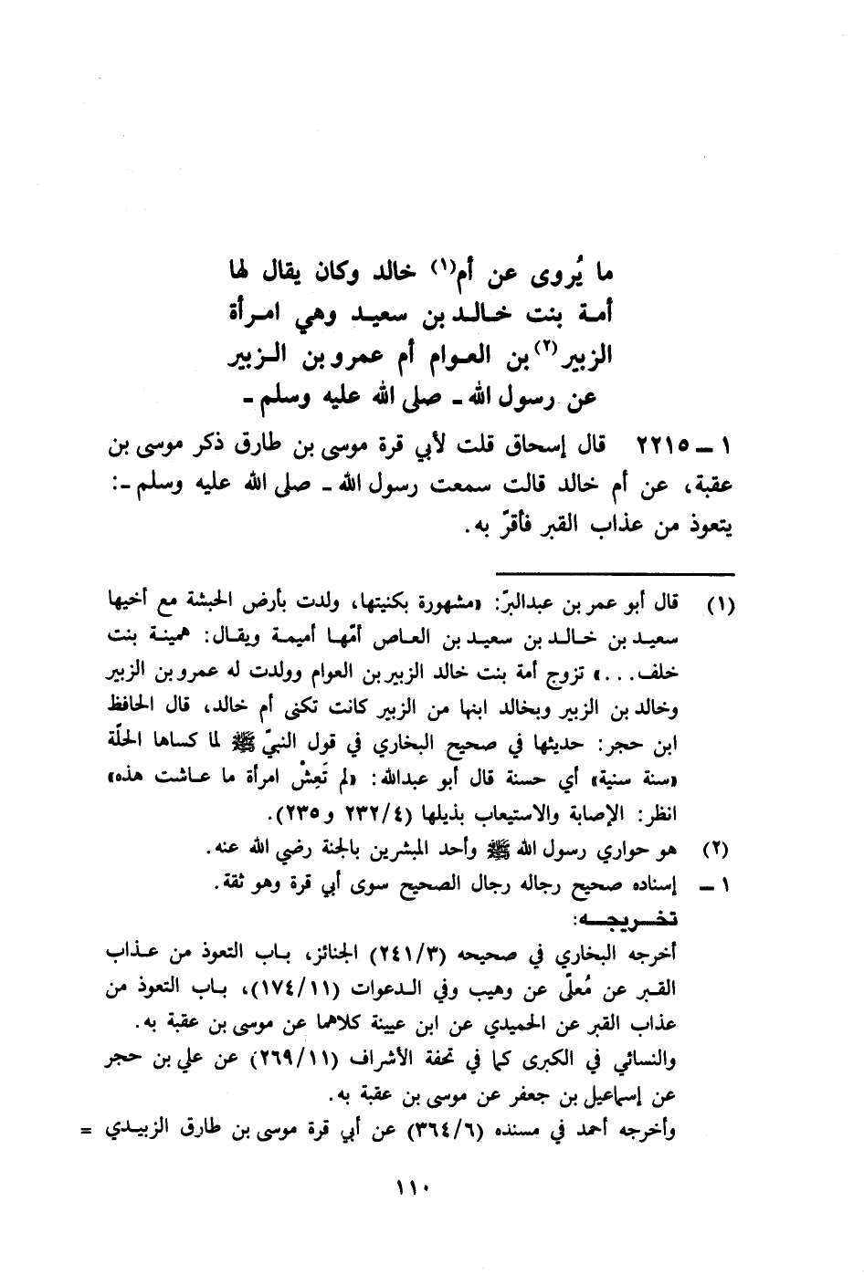 §مَا يُرْوَى عَنْ أُمِّ خَالِدٍ، وَكَانَ يُقَالُ لَهَا أَمَةُ بِنْتُ خَالِدِ بْنِ سَعِيدٍ، وَهِيَ امْرَأَةُ الزُّبَيْرِ بْنِ الْعَوَّامِ، أُمُّ عَمْرِو بْنِ الزُّبَيْرِ عَنْ رَسُولِ اللَّهِ صَلَّى اللهُ عَلَيْهِ وَسَلَّمَ