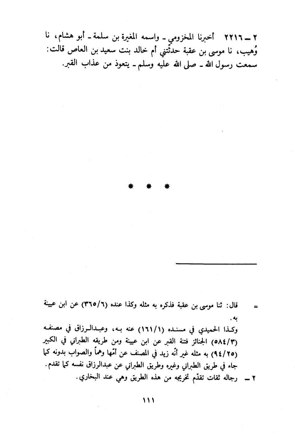2216 - أَخْبَرَنَا الْمَخْزُومِيُّ وَاسْمُهُ الْمُغِيرَةُ بْنُ سَلَمَةَ أَبُو هِشَامٍ، نا وُهَيْبٌ، نا مُوسَى بْنُ عُقْبَةَ، حَدَّثَتْنِي أُمُّ خَالِدٍ بِنْتُ سَعِيدِ بْنِ الْعَاصِ قَالَتْ: سَمِعْتُ رَسُولَ اللَّهِ صَلَّى اللهُ عَلَيْهِ وَسَلَّمَ «§يَتَعَوَّذُ مِنْ عَذَابِ الْقَبْرِ»