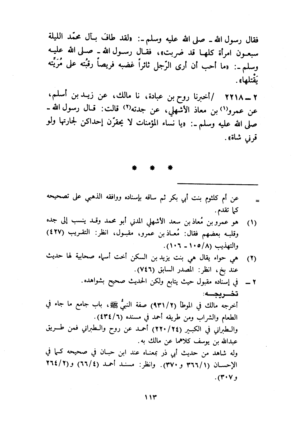 2218 - أَخْبَرَنَا رَوْحُ بْنُ عُبَادَةَ، نا مَالِكٌ، عَنْ زَيْدِ بْنِ أَسْلَمَ، عَنْ عَمْرِو بْنِ مُعَاذٍ الْأَشْهَلِيِّ، عَنْ جَدَّتِهِ، قَالَتْ: قَالَ رَسُولُ اللَّهِ صَلَّى اللهُ عَلَيْهِ وَسَلَّمَ: «يَا نِسَاءَ الْمُؤْمِنَاتِ , §لَا يُحَقِّرَنَّ إِحْدَاكُنَّ لِجَارَتِهَا , وَلَوْ قَرْنَيْ شَاةٍ»