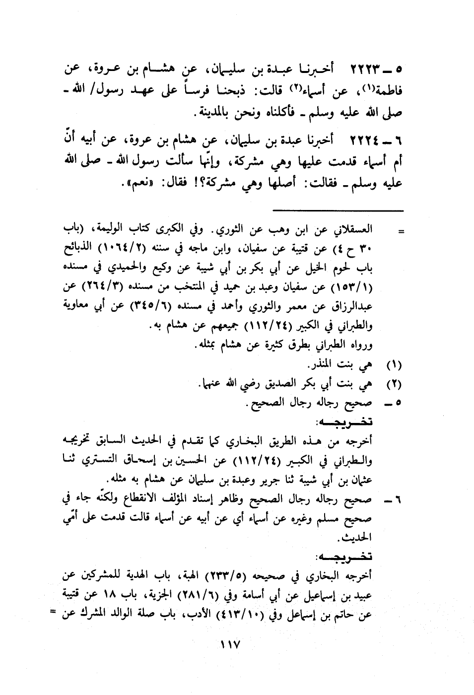 2223 - أَخْبَرَنَا عَبْدَةُ بْنُ سُلَيْمَانَ، عَنْ هِشَامِ بْنِ عُرْوَةَ، عَنْ فَاطِمَةَ، عَنْ أَسْمَاءَ قَالَتْ: «§ذَبَحْنَا فَرَسًا عَلَى عَهْدِ رَسُولِ اللَّهِ صَلَّى اللهُ عَلَيْهِ وَسَلَّمَ , فَأَكَلْنَاهُ وَنَحْنُ بِالْمَدِينَةِ»