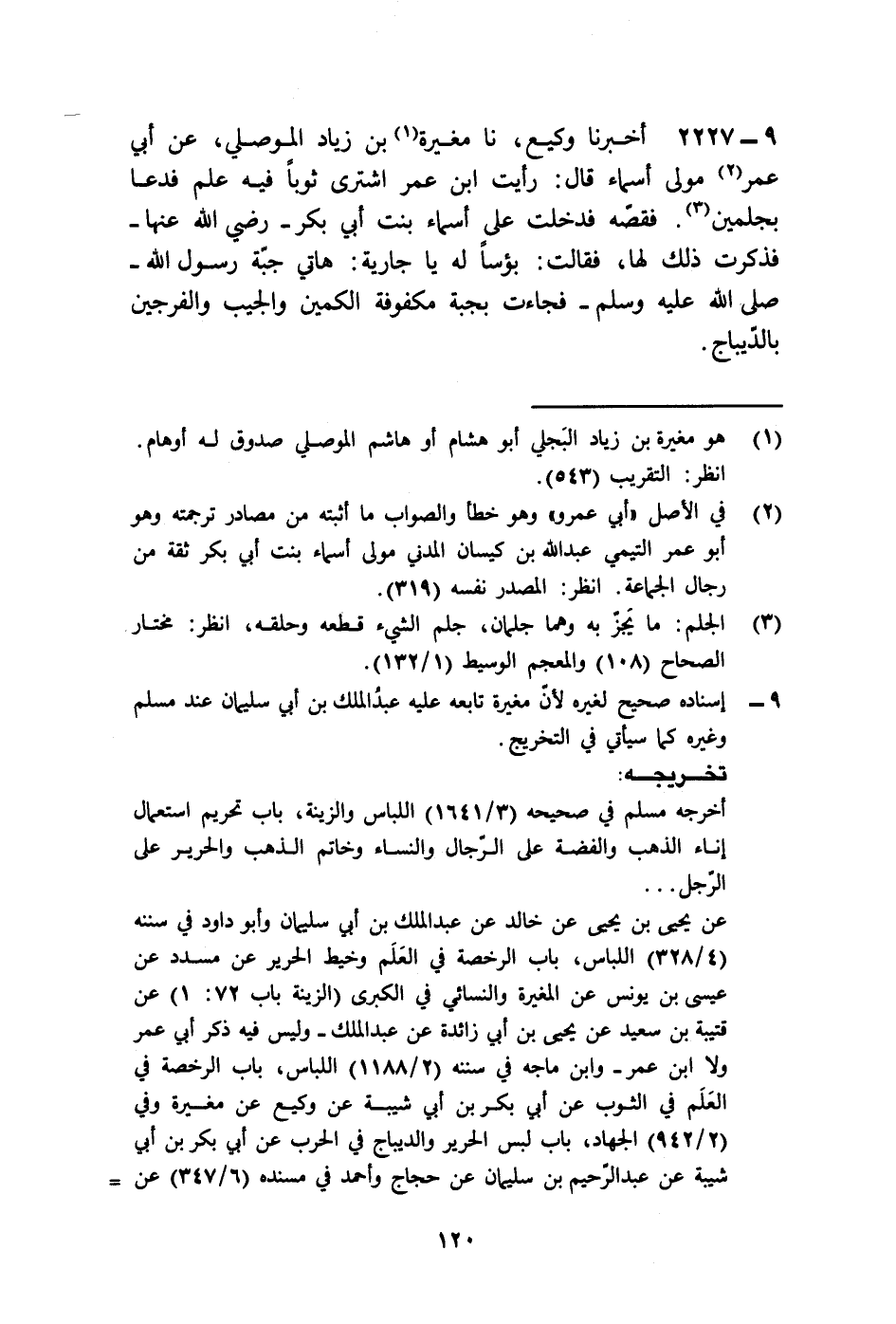 2227 - أَخْبَرَنَا وَكِيعٌ، نا مُغِيرَةُ بْنُ زِيَادٍ الْمَوْصِلِيُّ، عَنْ أَبِي عُمَرَ، - مَوْلَى أَسْمَاءَ - قَالَ: رَأَيْتُ ابْنَ عُمَرَ اشْتَرَى ثَوْبًا فِيهِ عَلَمٌ , فَدَعَا بِجَمَلَيْنِ فَقَصَّهُ , فَدَخَلَتْ عَلَيَّ أَسْمَاءُ بِنْتُ أَبِي بَكْرٍ رَضِيَ اللَّهُ عَنْهَا , فَذَكَرْتُ ذَلِكَ لَهَا , فَقَالَتْ: " بُؤْسًا لَهُ , يَا جَارِيَةُ: هَاتِي جُبَّةَ رَسُولِ اللَّهِ صَلَّى اللهُ عَلَيْهِ وَسَلَّمَ , §فَجَاءَتْ بِجُبَّةٍ مَكْفُوفَةِ الْكُمَّيْنِ وَالْجَيْبِ وَالْفَرْجَيْنِ بِالدِّيبَاجِ "
