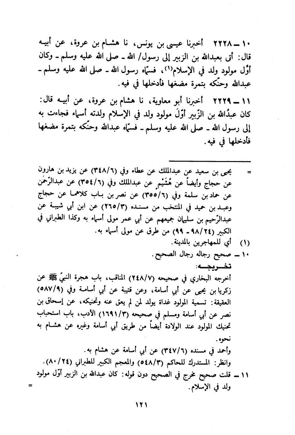 2228 - أَخْبَرَنَا عِيسَى بْنُ يُونُسَ، نا هِشَامُ بْنُ عُرْوَةَ، عَنْ أَبِيهِ قَالَ: «أُتِيَ بِعَبْدِ اللَّهِ بْنِ الزُّبَيْرِ إِلَى رَسُولِ اللَّهِ صَلَّى اللهُ عَلَيْهِ وَسَلَّمَ , وَكَانَ §أَوَّلَ مَوْلُودٍ وُلِدَ فِي الْإِسْلَامِ , فَسَمَّاهُ رَسُولُ صَلَّى اللهُ عَلَيْهِ وَسَلَّمَ عَبْدَ اللَّهِ , وَحَنَّكَهُ بِتَمْرَةٍ مَضَغَهَا فَأَدْخَلَهَا فِي فِيهِ»