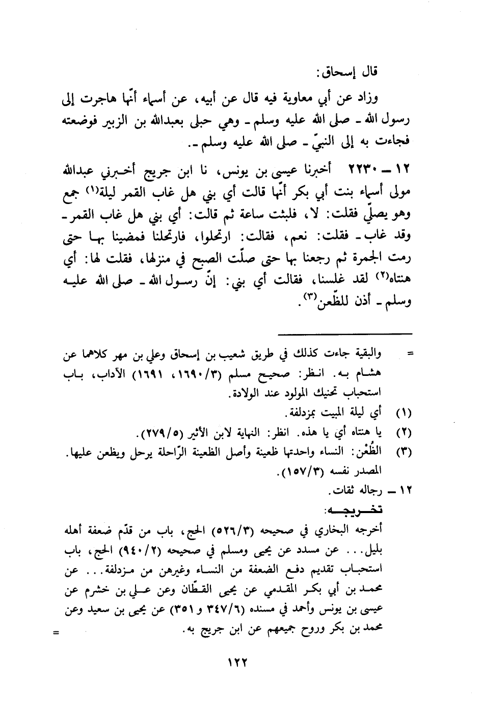 2230 - أَخْبَرَنَا عِيسَى بْنُ يُونُسَ، نا ابْنُ جُرَيْجٍ، أَخْبَرَنِي عَبْدُ اللَّهِ مَوْلَى أَسْمَاءَ بِنْتِ أَبِي بَكْرٍ أَنَّهَا قَالَتْ: " أَيْ بُنَيْ , §هَلْ غَابَ الْقَمَرُ لَيْلَةَ جَمَعَ وَهُوَ يُصَلِّي , فَقُلْتُ: لَا , فَلَبِثَتْ سَاعَةً , ثُمَّ قَالَتْ: أَيْ بُنَيْ هَلْ غَابَ الْقَمَرُ؟ وَقَدْ غَابَ، فَقُلْتُ: نَعَمْ , فَقَالَتِ: ارْتَحَلُوا , فَارْتَحَلْنَا , فَمَضَيْنَا بِهَا حَتَّى رَمَتِ الْجَمْرَةَ , ثُمَّ رَجَعْنَا بِهَا حَتَّى صَلَّتِ الصُّبْحَ فِي مَنْزِلِهَا , فَقُلْتُ لَهَا: أَيْ هَنْتَاهُ , لَقَدْ غَلَّسْنَا , فَقَالَتْ: أَيْ بُنَيْ , إِنَّ رَسُولَ اللَّهِ صَلَّى اللهُ عَلَيْهِ وَسَلَّمَ أَذِنَ لِلظَّعْنِ "