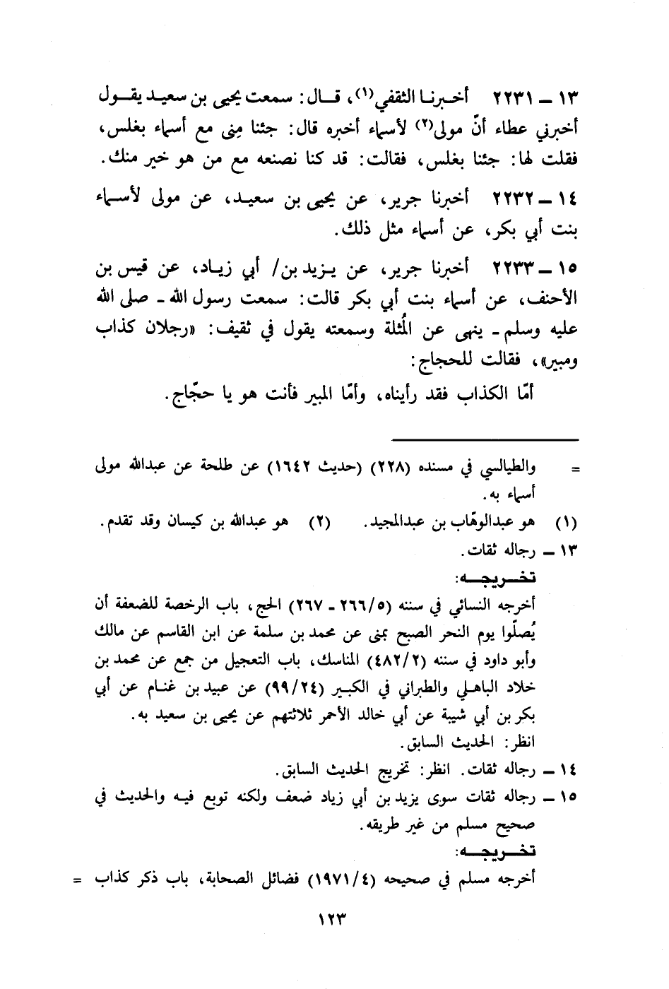 2233 - أَخْبَرَنَا جَرِيرٌ، عَنْ يَزِيدَ بْنِ أَبِي زِيَادٍ، عَنْ قَيْسِ بْنِ الْأَحْنَفِ، عَنْ أَسْمَاءَ بِنْتِ أَبِي بَكْرٍ قَالَتْ: سَمِعْتُ رَسُولَ اللَّهِ صَلَّى اللهُ عَلَيْهِ وَسَلَّمَ يَنْهَى عَنِ الْمُثْلَةَ , وَسَمِعْتُهُ يَقُولُ: «§فِي ثَقِيفٍ رَجُلَانِ كَذَّابٌ وَمُبِيرٌ» فَقَالَتْ لِلْحَجَّاجِ , أَمَا الْكَذَّابُ فَقَدْ رَأَيْنَاهُ , وَأَمَّا الْمُبِيرُ فَأَنْتَ هُوَ يَا حَجَّاجُ