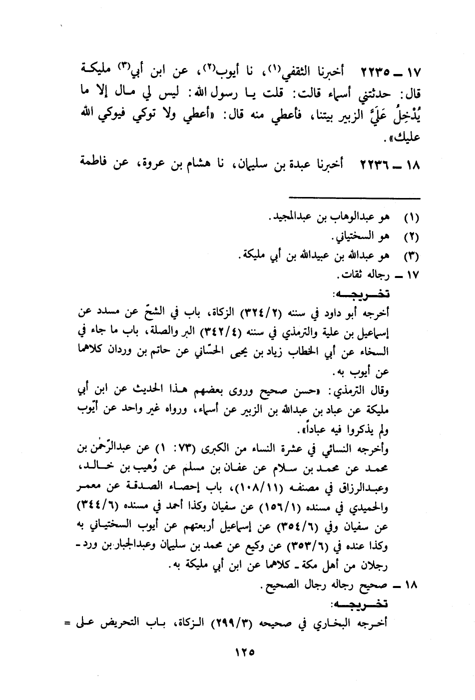 2235 - أَخْبَرَنَا الثَّقَفِيُّ، نا أَيُّوبُ، عَنِ ابْنِ أَبِي مُلَيْكَةَ قَالَ: حَدَّثَتْنِي أَسْمَاءُ قَالَتْ: قُلْتُ يَا رَسُولَ اللَّهِ: لَيْسَ لِي مَالٌ إِلَّا مَا يُدْخِلُ عَلَيَّ الزُّبَيْرُ بَيْتَنَا فَأُعْطِي مِنْهُ , قَالَ: «§أَعْطِي وَلَا تُوكِي , فَيُوكِيَ اللَّهُ عَلَيْكِ»