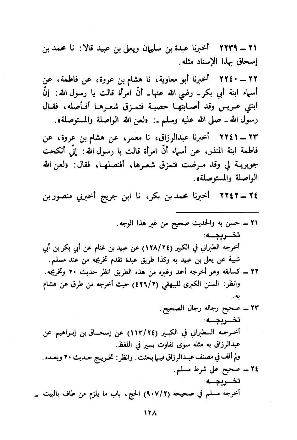 2240 - أَخْبَرَنَا أَبُو مُعَاوِيَةَ، نا هِشَامُ بْنُ عُرْوَةَ، عَنْ فَاطِمَةَ، عَنْ أَسْمَاءَ ابْنَةِ أَبِي بَكْرٍ رَضِيَ اللَّهُ عَنْهَا أَنَّ امْرَأَةً قَالَتْ: يَا رَسُولَ اللَّهِ إِنَّ ابْنَتِي عُرَيِّسٌ , وَقَدْ أَصَابَتْهَا حَصْبَةٌ فَتَمَزَّقَ شَعَرُهَا , أَفَأَصِلُهُ؟ فَقَالَ رَسُولُ اللَّهِ صَلَّى اللهُ عَلَيْهِ وَسَلَّمَ: «§لَعَنَ اللَّهُ الْوَاصِلَةَ وَالْمُسْتَوْصِلَةَ»
