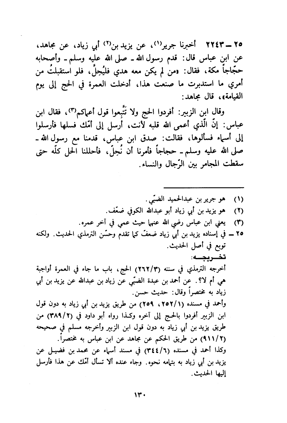 2243 - أَخْبَرَنَا جَرِيرٌ، عَنْ يَزِيدَ بْنِ أَبِي زِيَادٍ، عَنْ مُجَاهِدٍ، عَنِ ابْنِ عَبَّاسٍ قَالَ: قَدِمَ رَسُولُ اللَّهِ صَلَّى اللهُ عَلَيْهِ وَسَلَّمَ وَأَصْحَابُهُ حُجَّاجًا مَكَّةَ , فَقَالَ: «§مَنْ لَمْ يَكُنْ مَعَهُ هَدْي فَلْيَحِلَّ , فَلَوِ اسْتَقْبَلْتُ مِنْ أَمْرِي مَا اسْتَدْبَرْتُ مَا صَنَعْتُ هَذَا , أُدْخِلَتِ الْعُمْرَةُ فِي الْحَجِّ إِلَى يَوْمِ الْقِيَامَةِ» قَالَ مُجَاهِدٌ: وَقَالَ ابْنُ الزُّبَيْرٍ: أَفْرِدُوا الْحَجَّ وَلَا تَتَّبِعُوا قَوْلًا أَعْمَاكُمْ , فَقَالَ ابْنُ عَبَّاسٍ: إِنَّ الَّذِي أَعْمَى اللَّهُ قَلْبَهُ لَأَنْتَ , أَرْسِلْ إِلَى أُمِّكَ , فَسَلْهَا , فَأَرْسَلُوا إِلَى أَسْمَاءَ , فَسَأَلُوهَا , فَقَالَتْ: صَدَقَ ابْنُ عَبَّاسٍ , قَدِمْنَا مَعَ رَسُولِ اللَّهِ صَلَّى اللهُ عَلَيْهِ وَسَلَّمَ حُجَّاجًا فَأَمَرَنَا أَنْ نَحِلَّ , فَأَحْلَلْنَا الْحِلَّ كُلَّهُ , حَتَّى سَقَطَتِ الْمَجَامِرُ بَيْنَ الرِّجَالِ وَالنِّسَاءِ