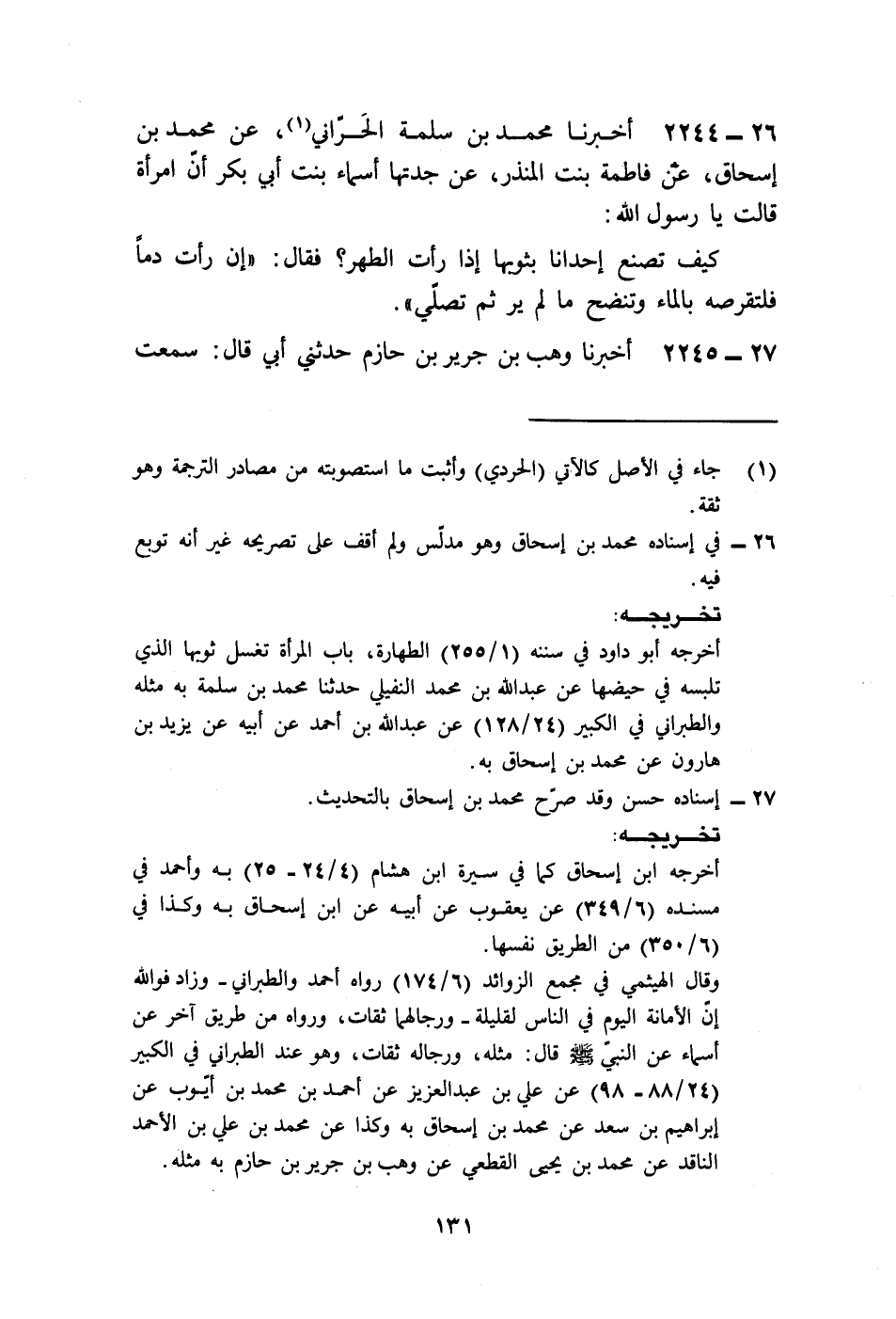 2244 - أَخْبَرَنَا مُحَمَّدُ بْنُ سَلَمَةَ الْحَرَّانِيُّ، عَنْ مُحَمَّدِ بْنِ إِسْحَاقَ، عَنْ فَاطِمَةَ بِنْتِ الْمُنْذِرِ، عَنْ جَدَّتِهَا أَسْمَاءَ بِنْتِ أَبِي بَكْرٍ أَنَّ امْرَأَةً قَالَتْ: يَا رَسُولَ اللَّهِ , كَيْفَ تَصْنَعُ إِحْدَانَا بِثَوْبِهَا إِذَا رَأَتِ الطُّهْرَ , فَقَالَ: «§إِنْ رَأَتْ دَمًا فَلْتَقْرُصْهُ بِالْمَاءِ , وَتَنْضَحُ مَا لَمْ يُرَ , ثُمَّ تُصَلِّي»