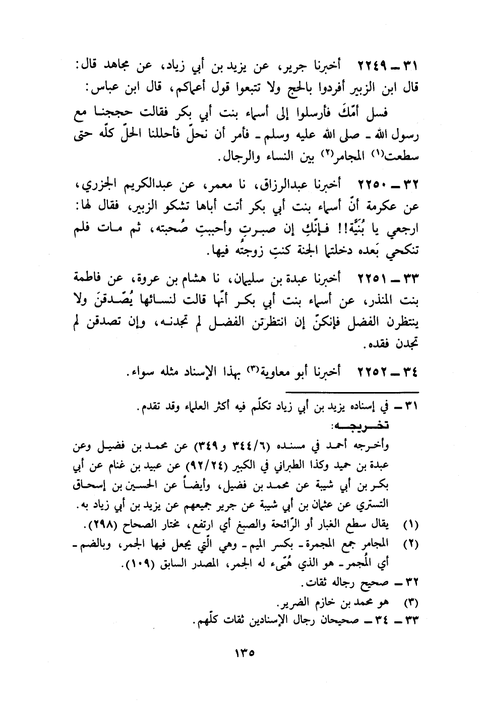2249 - أَخْبَرَنَا جَرِيرٌ، عَنْ يَزِيدَ بْنِ أَبِي زِيَادٍ، عَنْ مُجَاهِدٍ قَالَ: قَالَ ابْنُ الزُّبَيْرٍ: أَفْرِدُوا بِالْحَجِّ وَلَا تَتَّبِعُوا قَوْلَ أَعْمَاكُمْ , قَالَ ابْنُ عَبَّاسٍ: فَسَلْ أُمَّكَ , فَأَرْسَلُوا إِلَى أَسْمَاءَ بِنْتِ أَبِي بَكْرٍ فَقَالَتْ: «§حَجَجْنَا مَعَ رَسُولِ اللَّهِ صَلَّى اللهُ عَلَيْهِ وَسَلَّمَ فَأَمَرَ أَنْ نَحِلَّ فَأَحْلَلْنَا الْحِلَّ كُلَّهُ حَتَّى سَطَعَتِ الْمَجَامِرُ بَيْنَ النِّسَاءِ وَالرِّجَالِ»