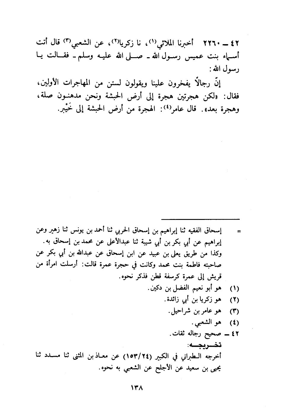 2260 - أَخْبَرَنَا الْمُلَائِيُّ، نا زَكَرِيَّا، عَنِ الشَّعْبِيِّ قَالَ: أَتَتْ أَسْمَاءُ بِنْتُ عُمَيْسٍ رَسُولَ اللَّهِ صَلَّى اللهُ عَلَيْهِ وَسَلَّمَ فَقَالَتْ: يَا رَسُولَ اللَّهِ، إِنَّ رِجَالًا يَفْخَرُونَ عَلَيْنَا وَيَقُولُونَ: لَسْتُنَّ مِنَ الْمُهَاجِرَاتِ الْأَوَّلِينَ، فَقَالَ: " §لَكُنَّ هِجْرَتَانِ: هِجْرَةٌ إِلَى أَرْضِ الْحَبَشَةِ وَنَحْنُ مُدْهِنُونَ صِلَةً، وَهِجْرَةٌ بَعْدُ " قَالَ عَامِرٌ: الْهِجْرَةُ مِنْ أَرْضِ الْحَبَشَةِ إِلَى خَيْبَرَ