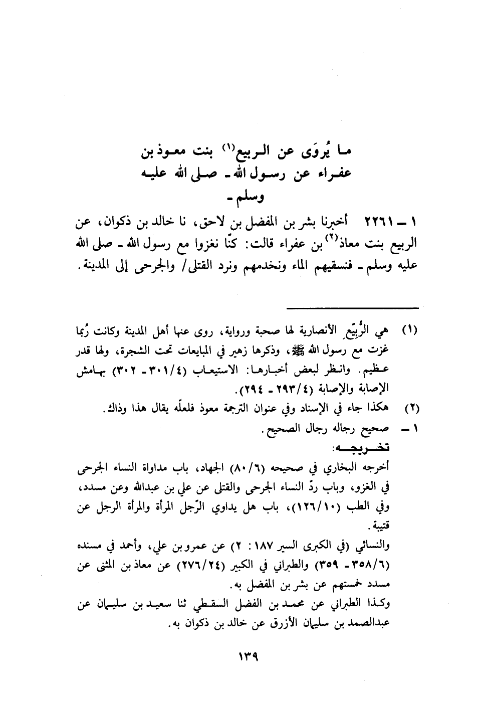 2261 - أَخْبَرَنَا بِشْرُ بْنُ الْمُفَضَّلِ بْنِ لَاحِقٍ، نا خَالِدُ بْنُ ذَكْوَانَ، عَنِ الرُّبَيِّعِ بِنْتِ مُعَاذِ ابْنِ عَفْرَاءَ قَالَتْ: «§كُنَّا نَغْزُوا مَعَ رَسُولِ اللَّهِ صَلَّى اللهُ عَلَيْهِ وَسَلَّمَ فَنَسْقِيهِمُ الْمَاءَ وَنَخْدُمُهُمْ وَنَرُدُّ الْقَتْلَى وَالْجَرْحَى إِلَى الْمَدِينَةِ»