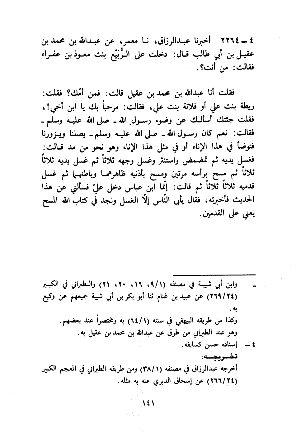 2264 - أَخْبَرَنَا عَبْدُ الرَّزَّاقِ، نا مَعْمَرٌ، عَنْ عَبْدِ اللَّهِ بْنِ مُحَمَّدِ بْنِ عَقِيلِ بْنِ أَبِي طَالِبٍ قَالَ: دَخَلْتُ عَلَى الرُّبَيِّعِ بِنْتِ مُعَوِّذِ ابْنِ عَفْرَاءَ فَقَالَتْ: " §مَنْ أَنْتَ؟ فَقُلْتُ: أَنَا عَبْدُ اللَّهِ بْنُ مُحَمَّدِ بْنِ عَقِيلٍ، قَالَتْ: فَمَنْ أُمُّكَ؟ فَقُلْتُ: رَيْطَةُ بِنْتُ عَلِيٍّ أَوْ فُلَانَةُ بِنْتُ عَلِيٍّ، فَقَالَتْ: مَرْحَبًا بِكَ يَا ابْنَ أَخِي، فَقُلْتُ: جِئْتُكَ أَسْأَلُكِ عَنْ وُضُوءِ رَسُولِ اللَّهِ صَلَّى اللهُ عَلَيْهِ وَسَلَّمَ، فَقَالَتْ: نَعَمْ كَانَ رَسُولُ اللَّهِ صَلَّى اللهُ عَلَيْهِ وَسَلَّمَ يَصِلُنَا وَيَزُورَنَا، فَتَوَضَّأَ فِي هَذَا الْإِنَاءِ، أَوْ فِي مِثْلِ هَذَا الْإِنَاءِ، وَهُوَ نَحْوٌ مِنْ مُدٍّ، قَالَتْ: فَغَسَلَ يَدَيْهِ، ثُمَّ تَمَضْمَضَ، وَاسْتَنْثَرَ، وَغَسَلَ وَجْهَهُ ثَلَاثًا، ثُمَّ غَسَلَ يَدَيْهِ ثَلَاثًا ثَلَاثًا، ثُمَّ مَسَحَ بِرَأْسِهِ مَرَّتَيْنِ، وَمَسَحَ بِأُذُنَيْهِ ظَاهِرِهِمَا وَبَاطِنِهِمَا، ثُمَّ غَسَلَ قَدَمَيْهِ ثَلَاثًا ثَلَاثًا، ثُمَّ قَالَتْ: إِنَّمَا ابْنُ عَبَّاسٍ دَخَلَ عَلَيَّ فَسَأَلَنِي عَنْ هَذَا الْحَدِيثِ، فَأَخْبَرْتُهُ، فَقَالَ: يَأْبَى النَّاسُ إِلَّا الْغَسْلَ، وَنَجِدُ فِي كِتَابِ اللَّهِ الْمَسْحَ , يَعْنِي: عَلَى الْقَدَمَيْنِ "